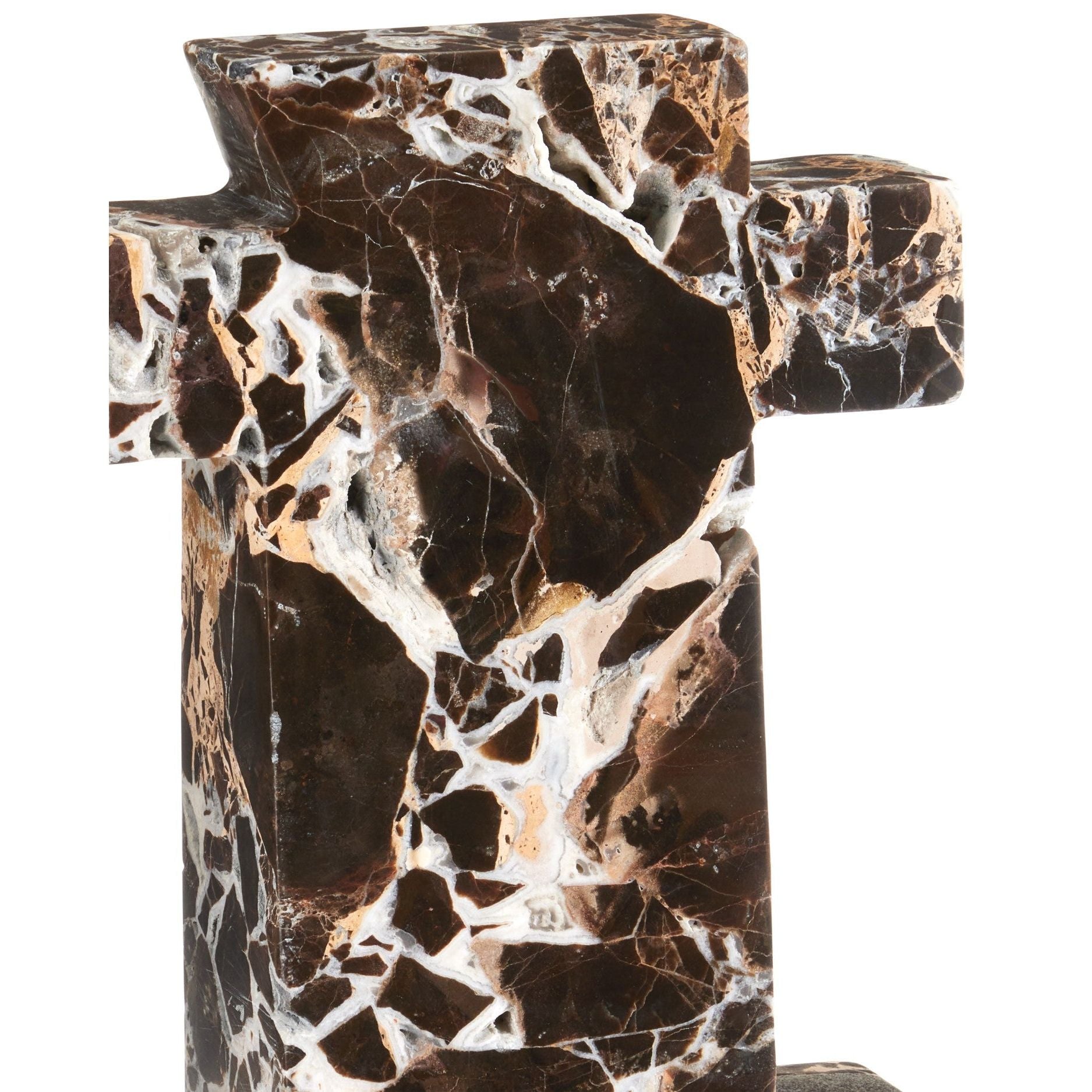The Blount Marble Object is a striking geometric sculpture crafted from Emperador stone, a luxurious marble known for its rich dark brown color and natural pitting. Bold veining runs throughout the piece, adding depth and visual interest to its intricate design. Perfect as a statement accent or a sophisticated addition to any display, this sculpture showcases the timeless elegance of natural stone.