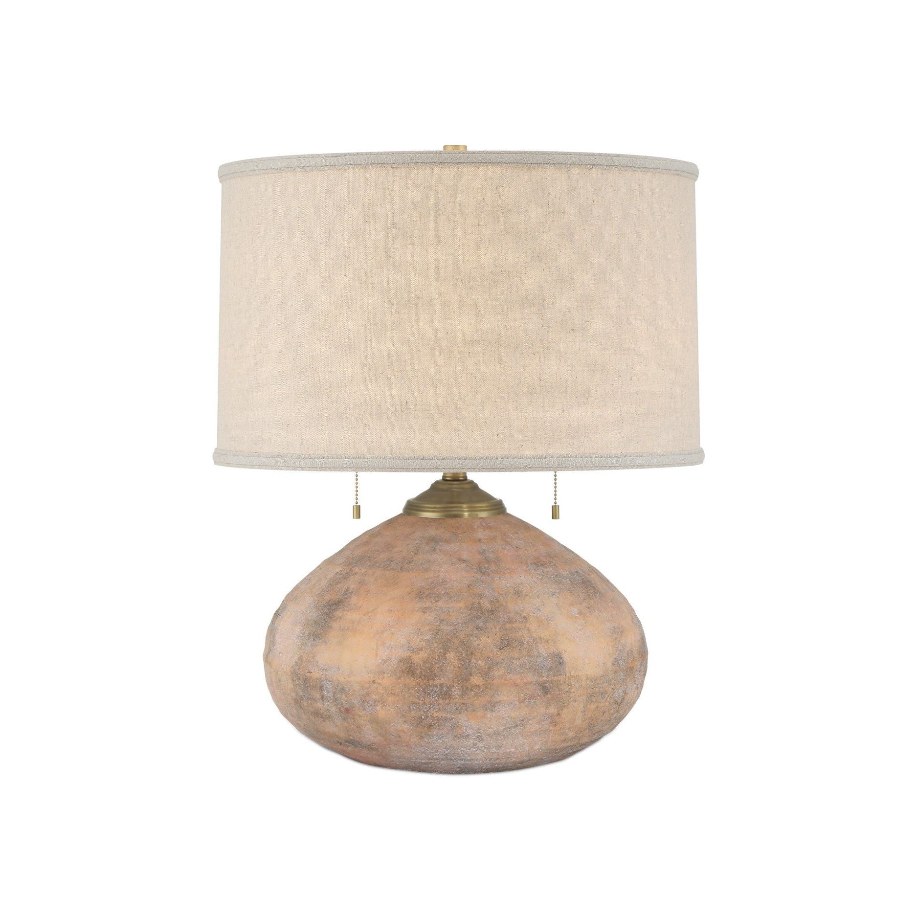 The Kenmare Table Lamp features an earthen-toned terracotta body finished with a textured antique brown glaze that enhances its ribbed surface and gives it the appearance of a timeworn artifact. The aged look is balanced by a tailored shade, detailed with a double layer of self-trim along the top and bottom edges. The metal hardware, finial, and dual pull-chains in an antique brass finish complete the design.