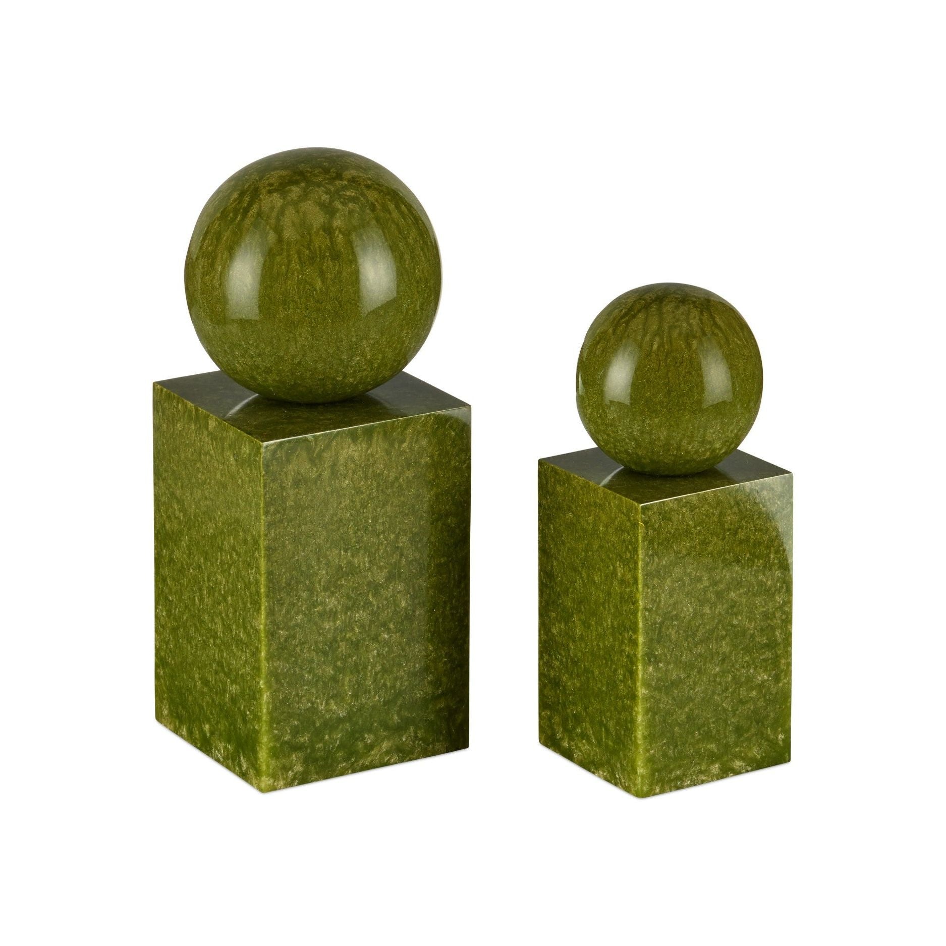 The Nova Object Set features a pair of striking sculptures that blend modern design with artistic craftsmanship. Their swirling surfaces, created by mixing pearlescent powder with composite, produce captivating organic patterns that cover every angle of the geometric forms. These decorative accessories are perfect as statement pieces or accents for shelves and tabletops.