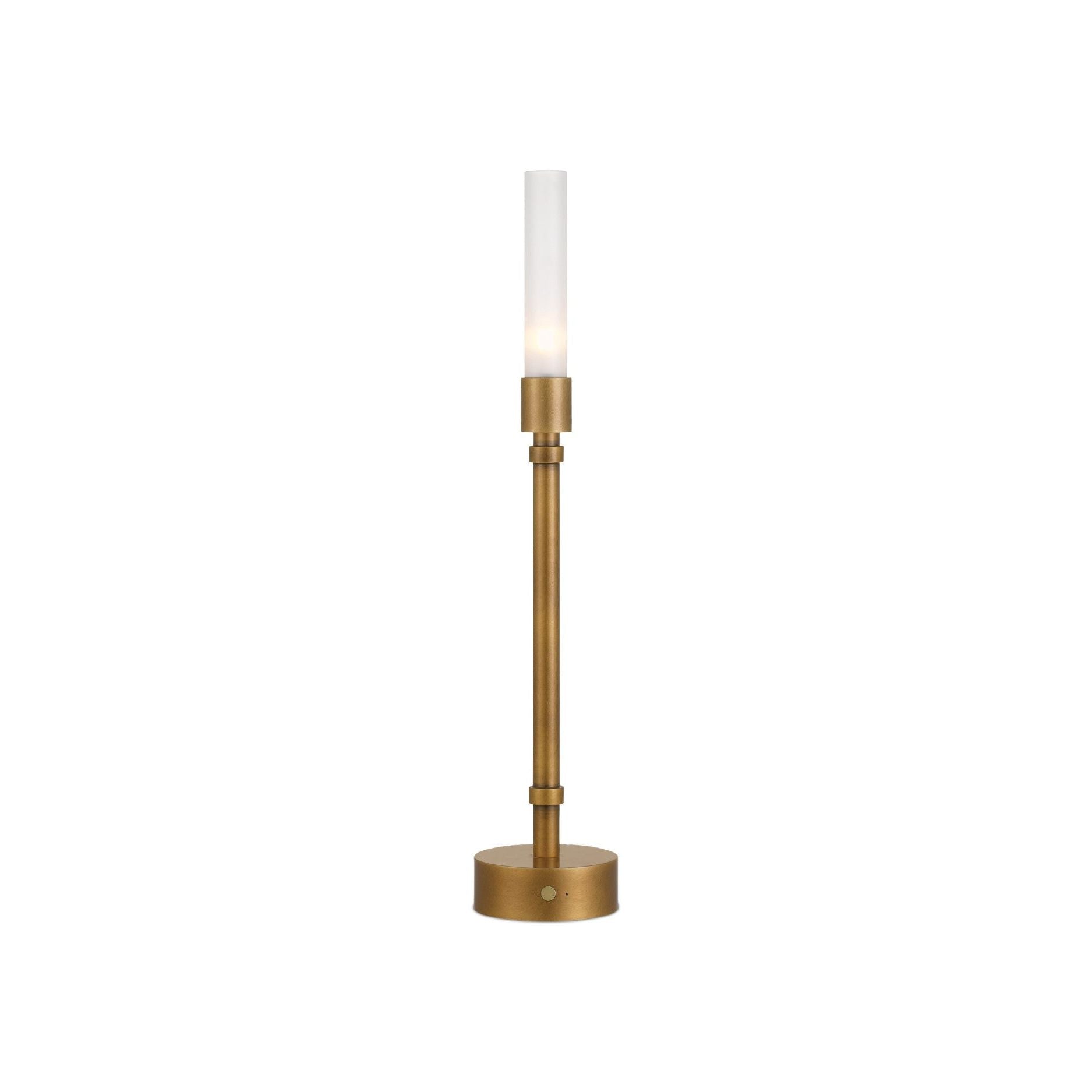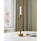 The Paseo Brass Cordless Table Lamp features a sleek candelabra silhouette topped with a slender, tube-shaped diffuser made of frosted white glass that softens and enhances the glow of the bulb. Its rechargeable base allows for easy portability, making it a versatile lighting option throughout the home. With its minimalist profile and warm brass finish, this lamp is perfect for centerpieces—delivering the ambiance of candlelight without blocking the view across the table.