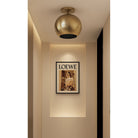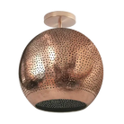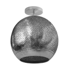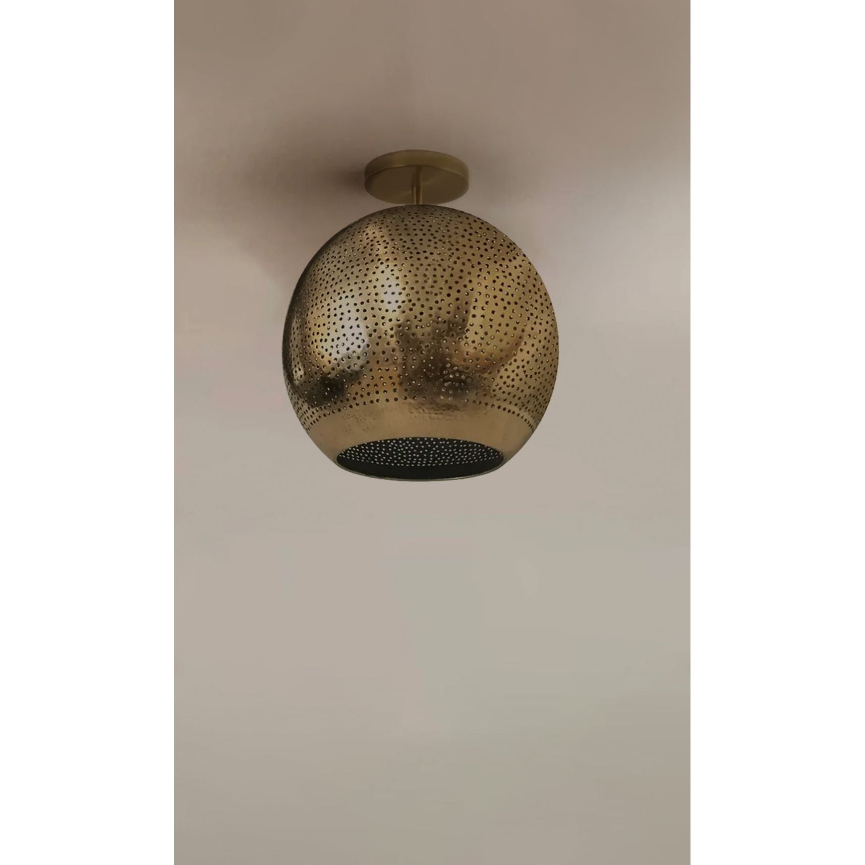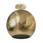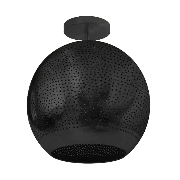 Shams Semi-flush light is the sun that never sets. This luxurious ceiling light provides the perfect ambient glow and offers a warm, modern look. Its tiny hand-pierced perforations throughout its body allow it to create a soothing envelope of soft, ambient light. The domed shape of the shade is constructed out of durable semi-precious metals that are hand-shaped and hand-finished to perfection. May be wall or ceiling-mounted.