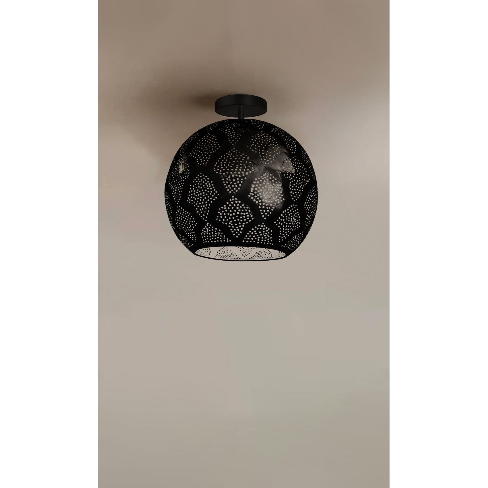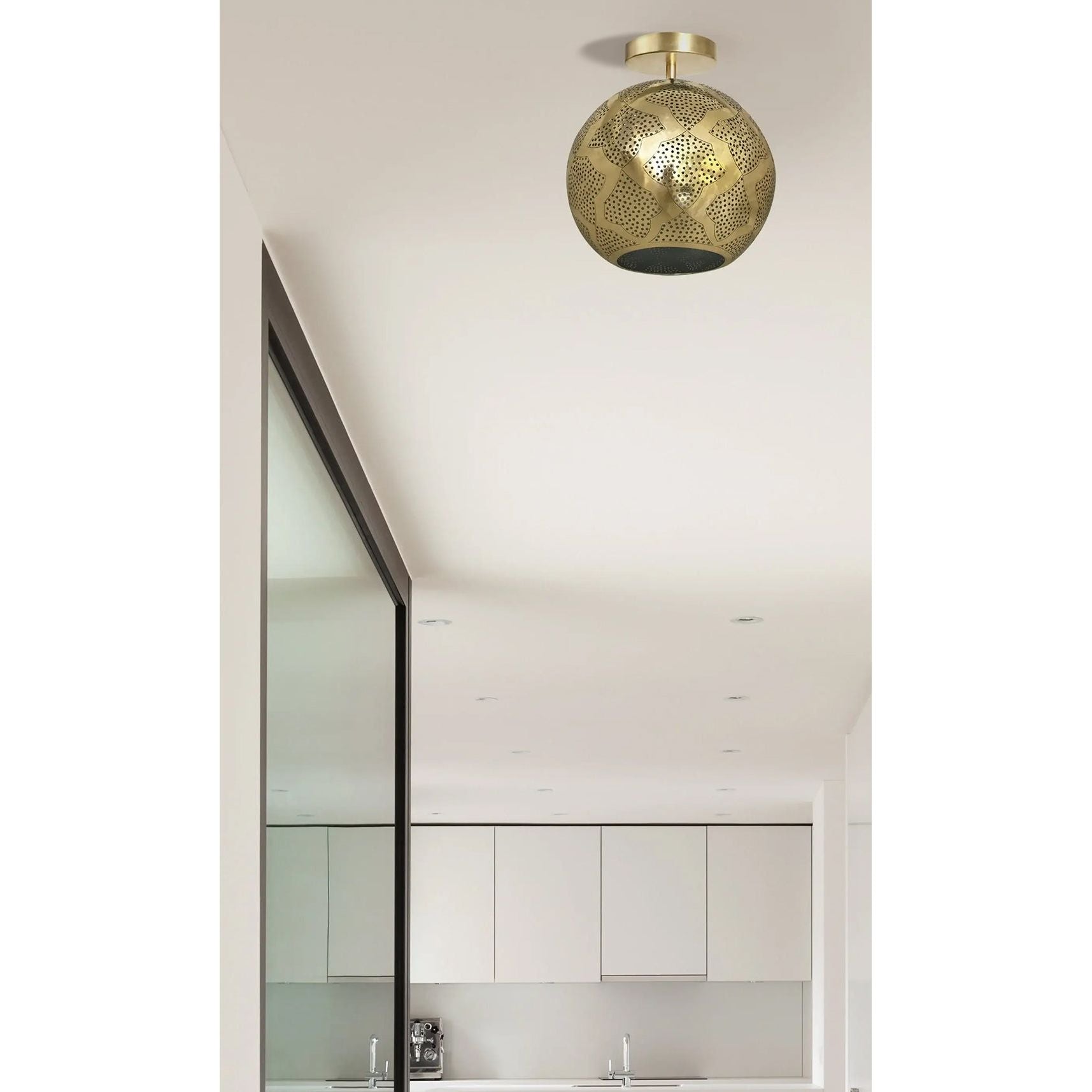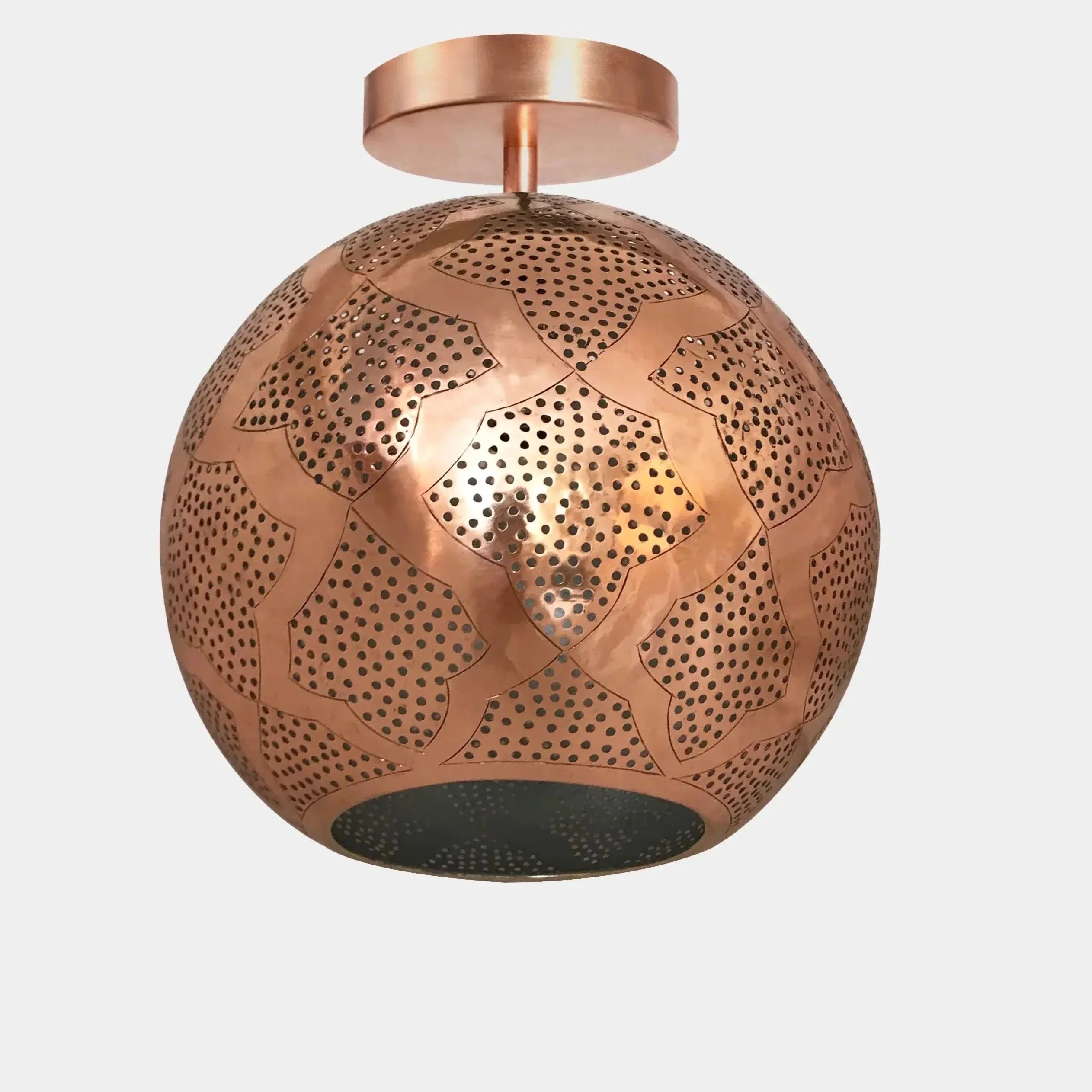 Warda is our modern Moroccan semi-flush light made from semi-precious punched metal and pierced designs. The sphere shape is modern with a hint of mid-century. It's handcrafted by master artisans in the heart of Marrakech, Morocco. The intricate holes create a stunning shadow pattern onto the walls allowing the light to shine through for amazing ambient light. What an amazing way to bring a luxurious global feel to your home and add a touch to the beautiful city of Marrakech.
