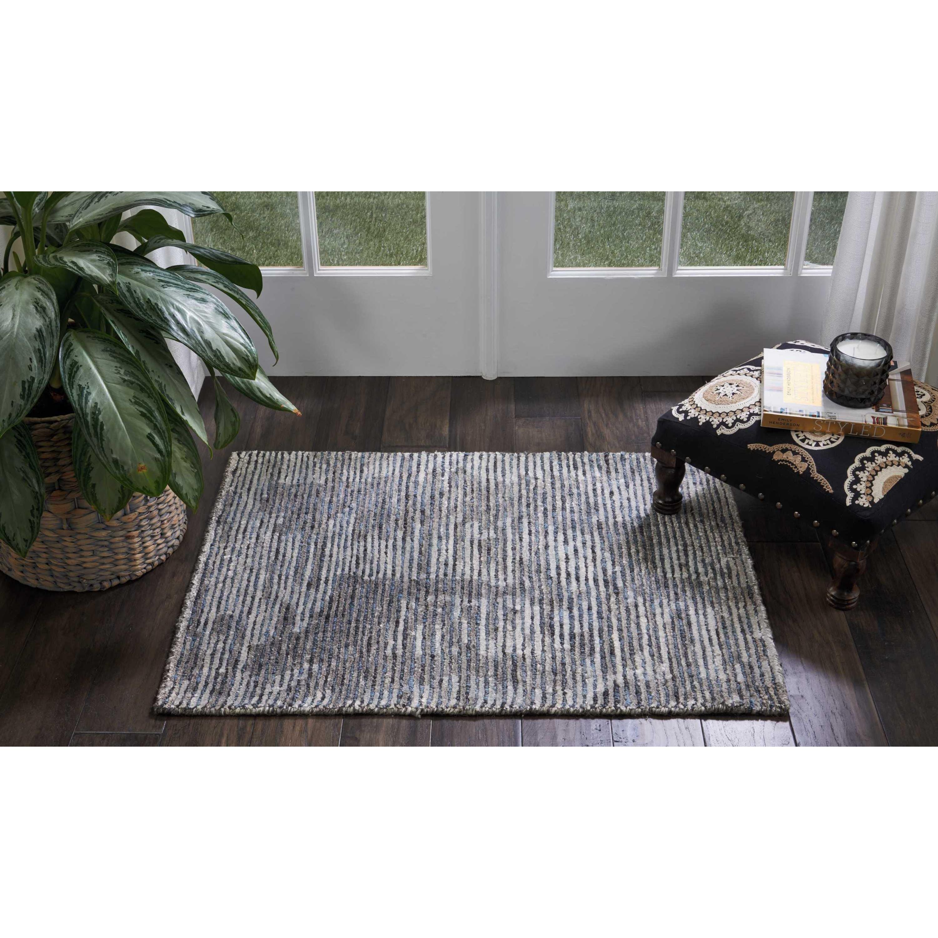 Elevate your stylish living space with the Ellora ELL03 Slate area rug from Nourison. This modern collection offers a touch of sophistication to any room. Explore a variety of artistic designs showcasing abstract linear patterns and gentle color washes. The Ellora color palette features contemporary neutrals with transitional tones, perfect for complementing diverse decor styles. Hand-knotted using a high-performance blend of wool, rayon, and cotton, this rug boasts a luxurious texture that combines quality, comfort, and elegant design seamlessly. Enhance your home with the timeless beauty and versatility of the Ellora ELL03 Slate rug.