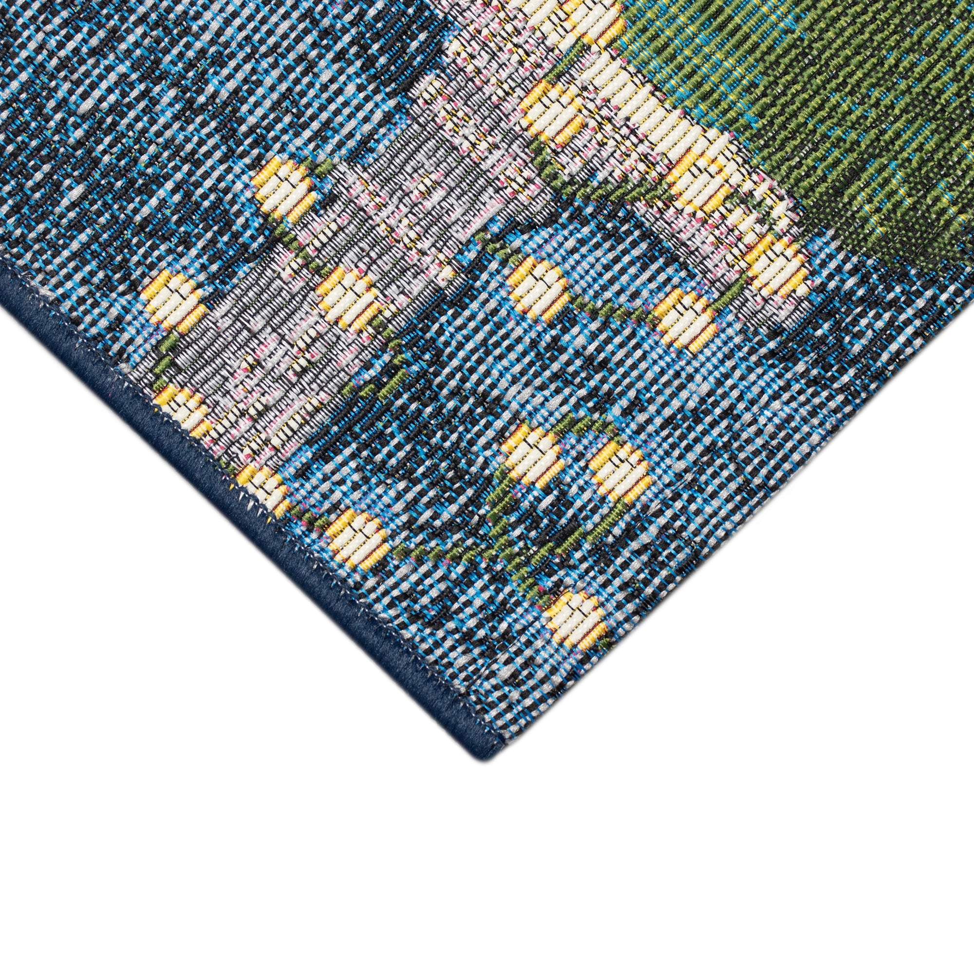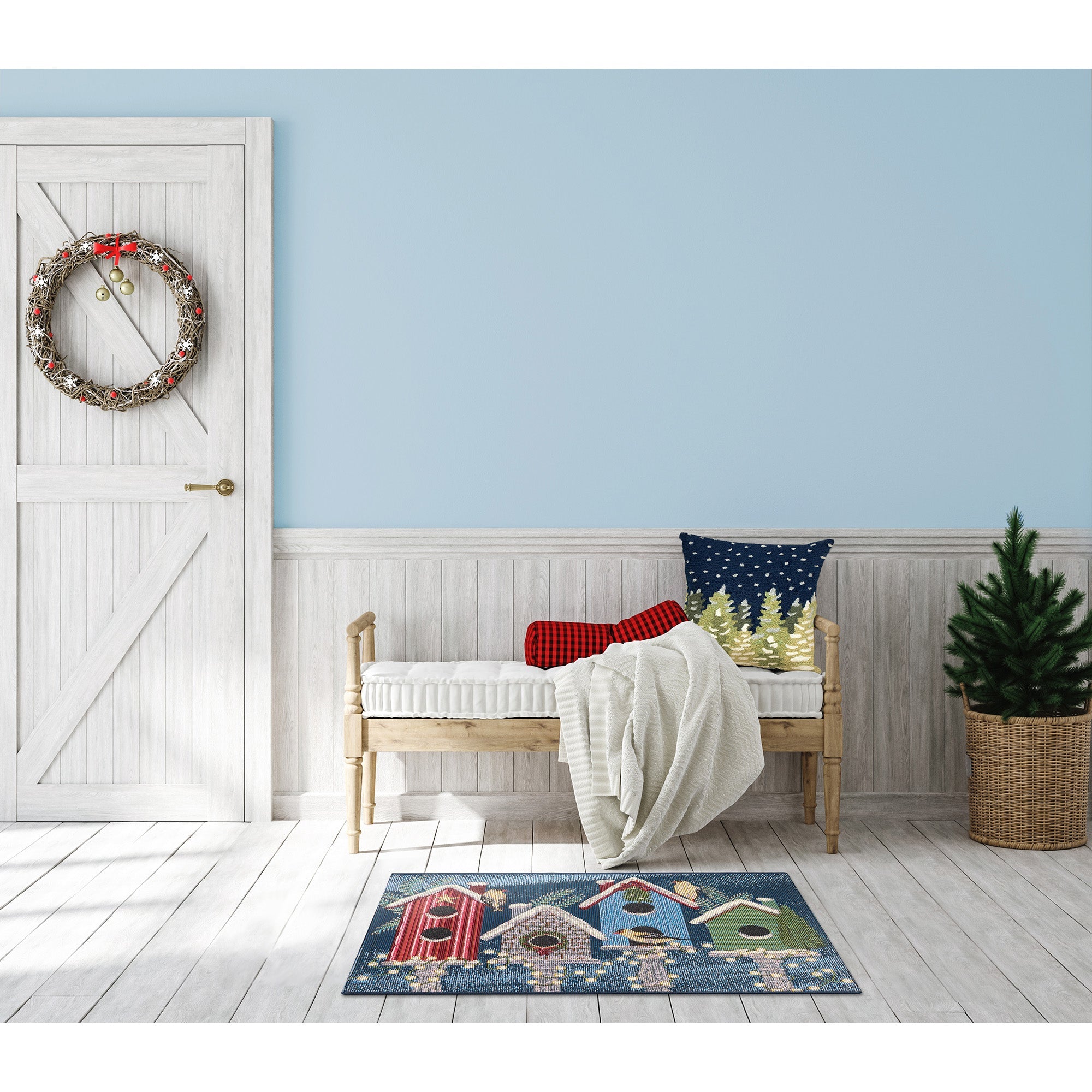 charming Esencia Birdhouse Holiday Navy, a delightful addition to your home decor. This whimsical novelty mat showcases beautifully decorated birdhouses in festive hues of red, green, grey, and light blue, complete with adorable birds perched atop. The navy background adds a touch of elegance and makes this mat perfect for the holiday season.