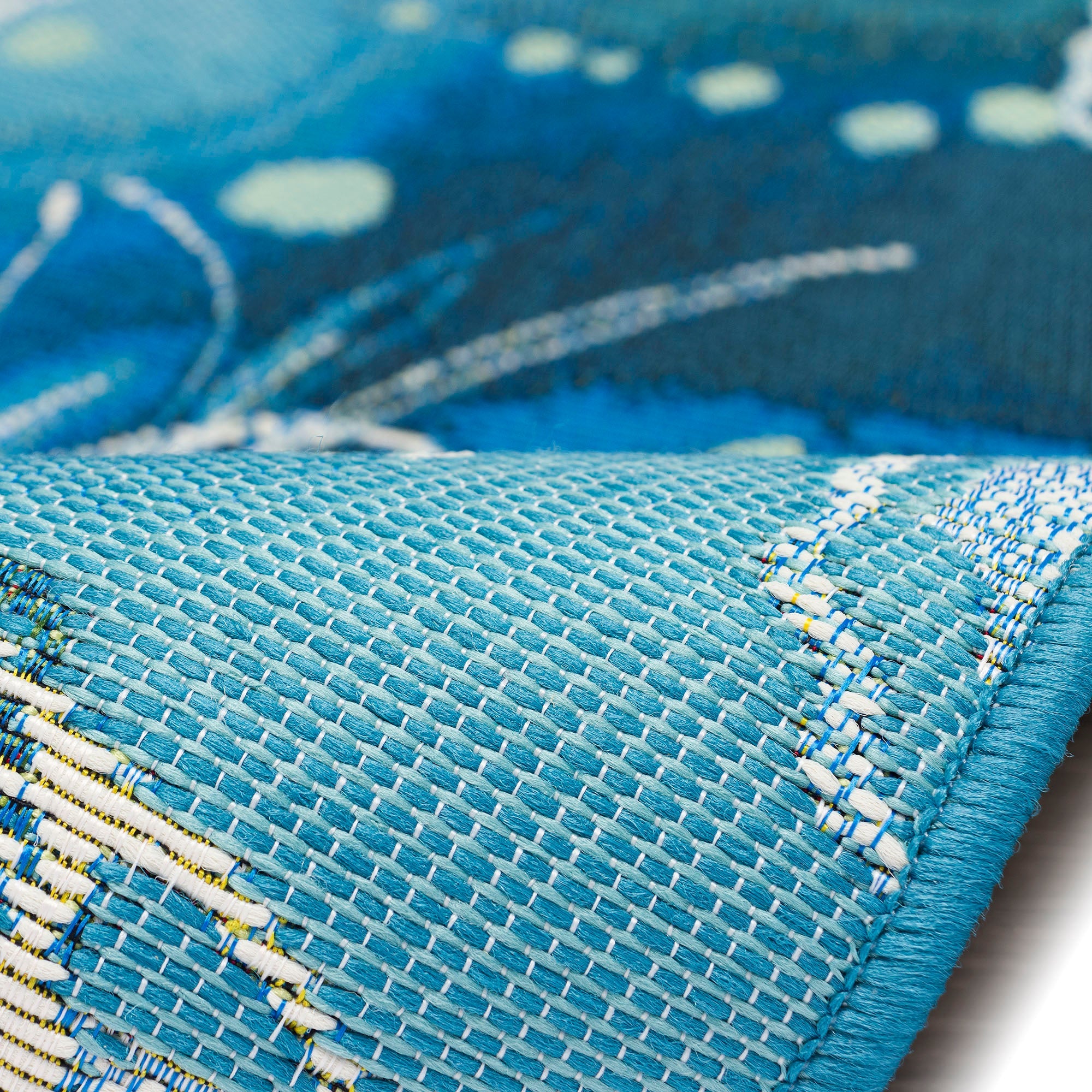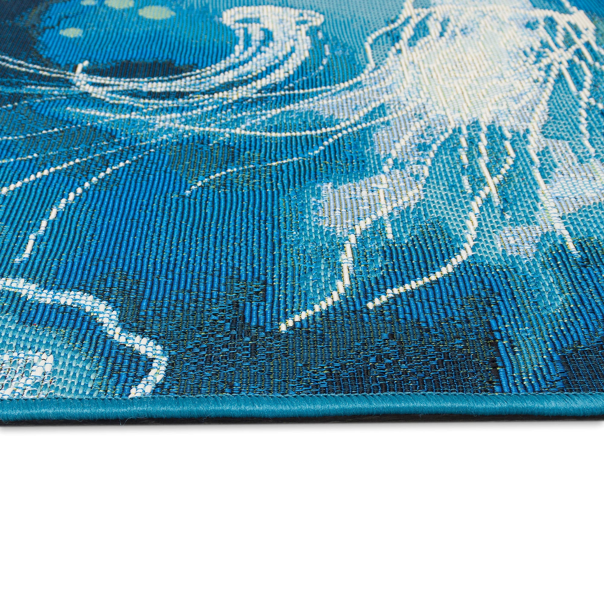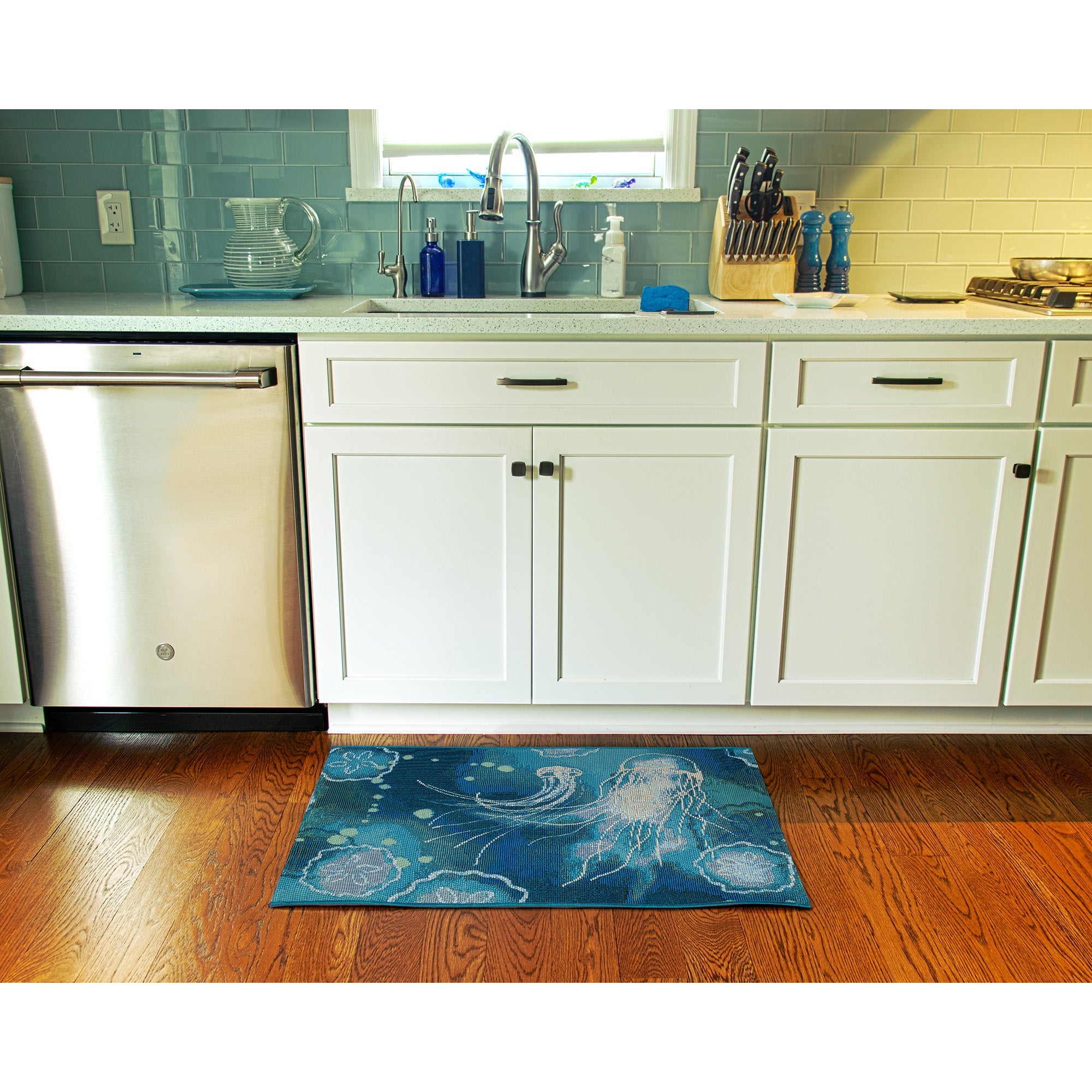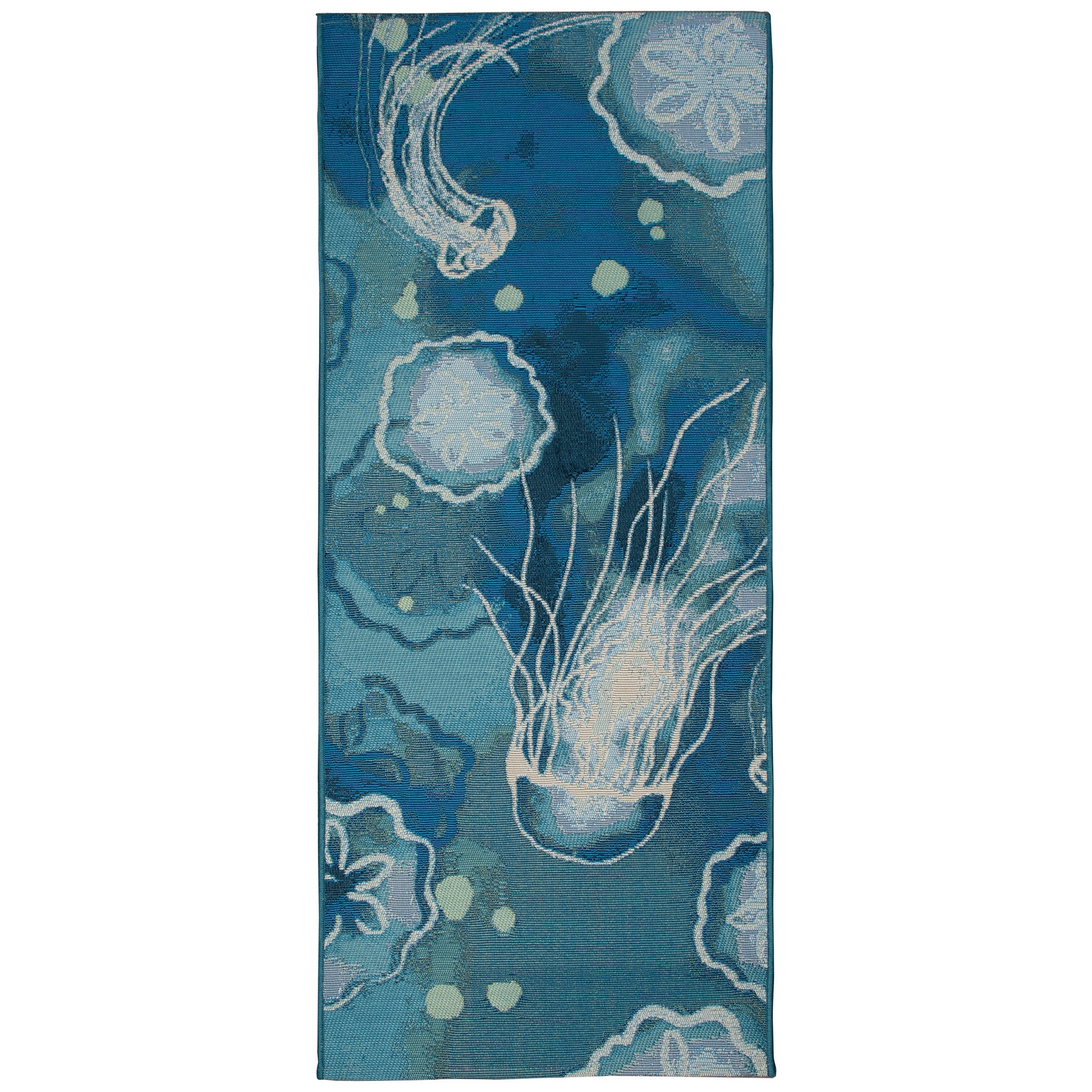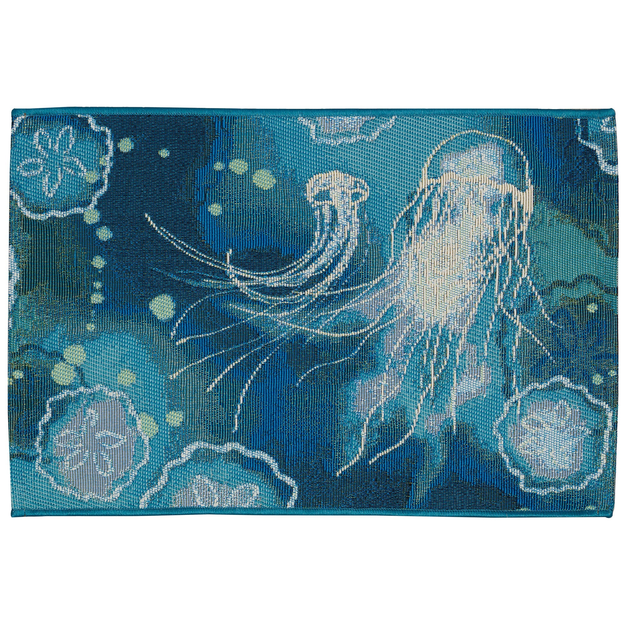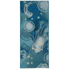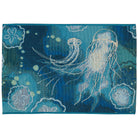 Introducing our Esencia Jelly Fish Blue mat, a delightful addition to your home decor. This coastal-inspired mat showcases a whimsical and vibrant abstract underwater design in shades of navy, blue, and aqua, adorned with white accents. The graceful jellyfish and sand dollars gracefully glide through the current, creating a serene and tranquil atmosphere. Whether placed indoors or outdoors, this transitional design effortlessly enhances any space with its soothing aesthetic.
