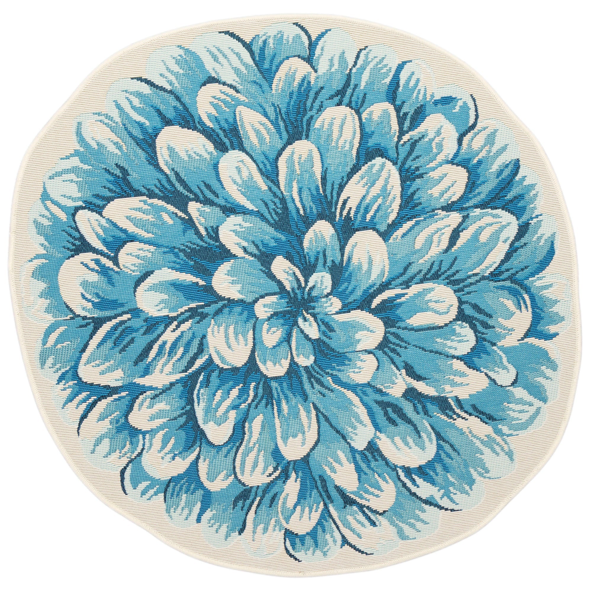 exquisite Esencia Mum Blue, a stunning decorative garden mat that boasts a unique Mum-shaped design. This transitional piece showcases a whimsical oversized blossom in a beautiful color palette of blue, navy, and ivory. Perfect for adding a touch of elegance and charm to any outdoor space, this floral mat is sure to captivate the eye and elevate your garden decor.