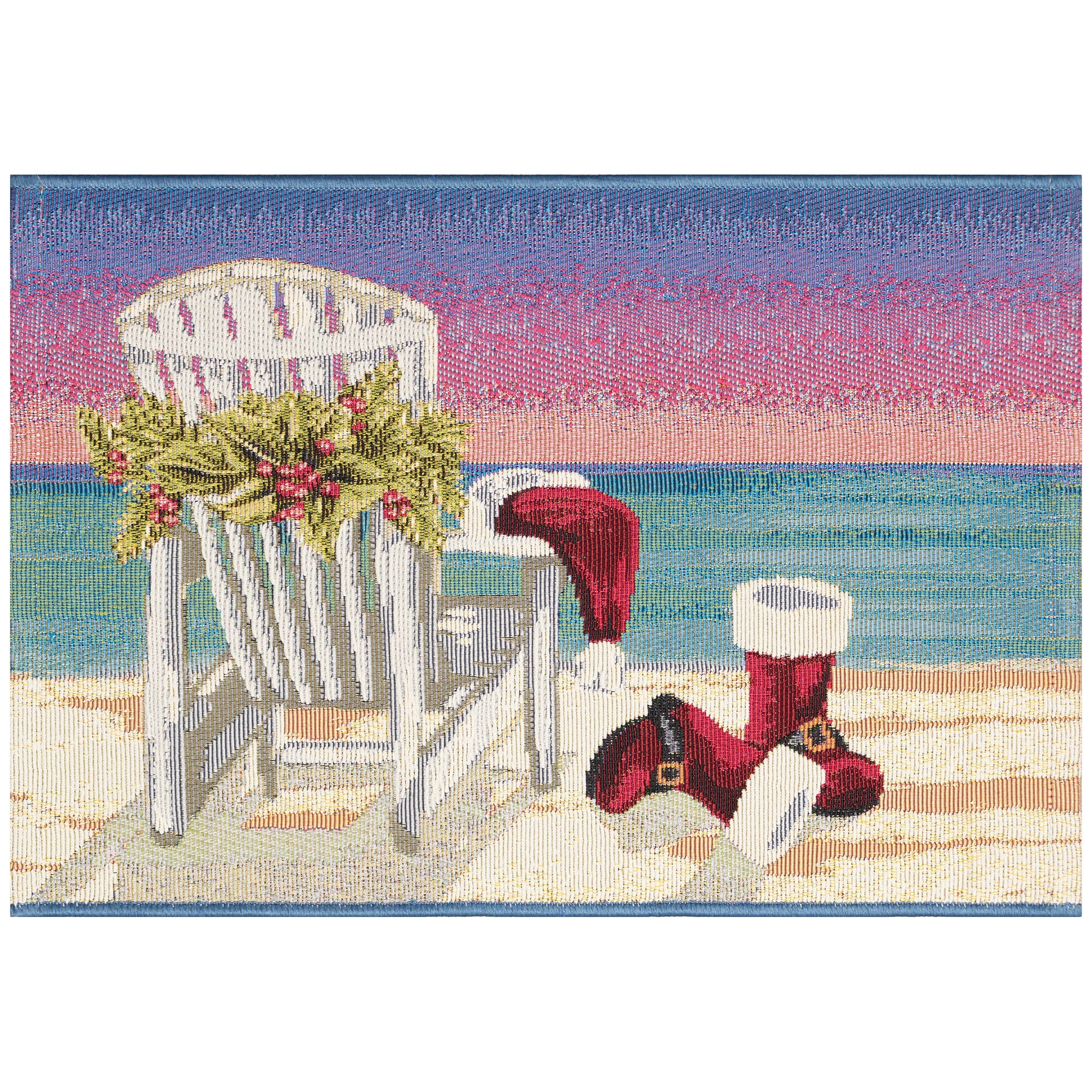 charming Esencia Santa Siesta Blue mat, perfect for adding a touch of holiday cheer to your space. This whimsical novelty mat showcases a serene scene with a white beach chair overlooking a tranquil blue ocean under a twilight sky adorned with festive red and green botanicals, as well as Santa's iconic red boots and hat. Brighten up your home with this delightful and unique mat that effortlessly captures the spirit of the holidays.