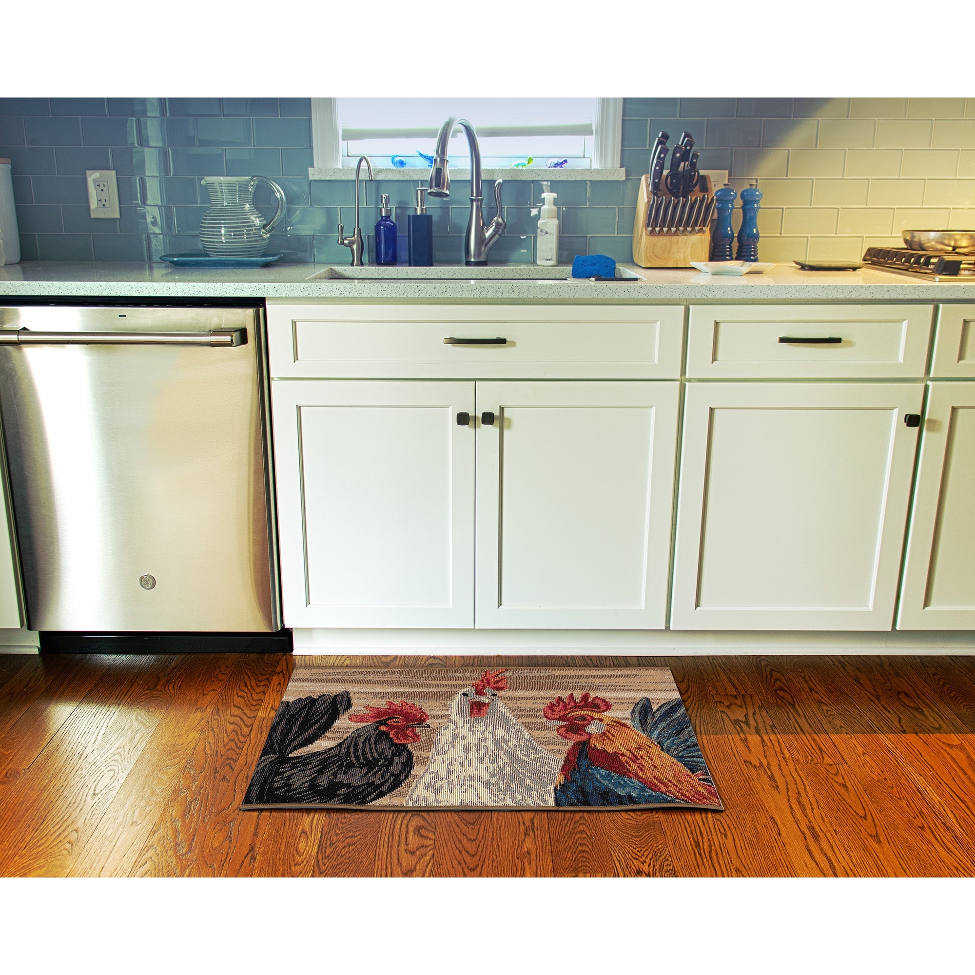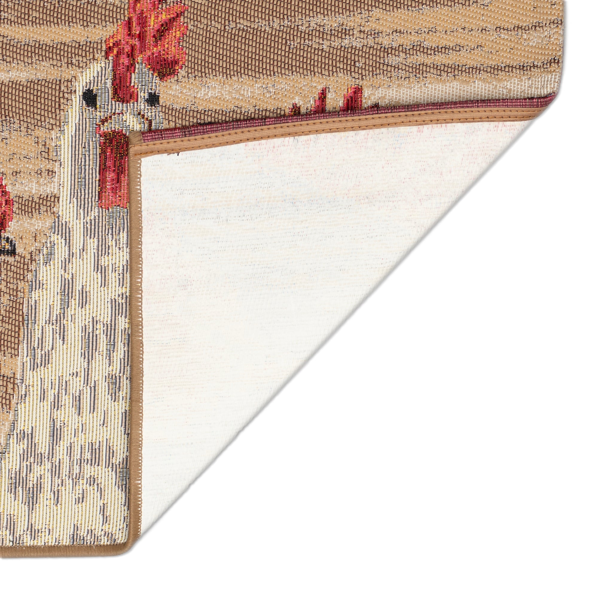 Esencia Three Roosters Natural mat, a charming addition to your home decor. This delightful novelty bird mat showcases colorful roosters dancing across a serene natural backdrop. Perfect for adding a touch of whimsy and traditional flair to any room in your home.