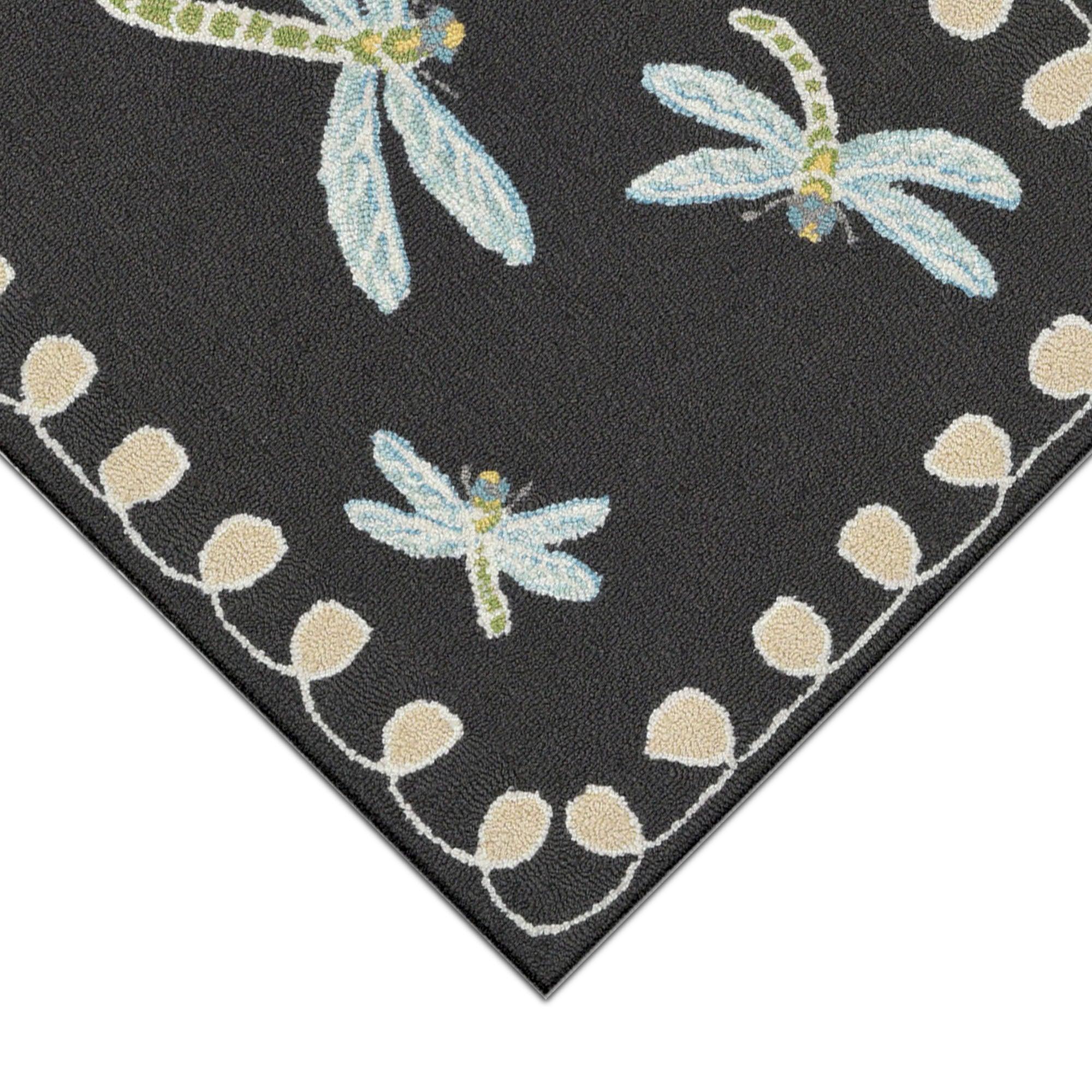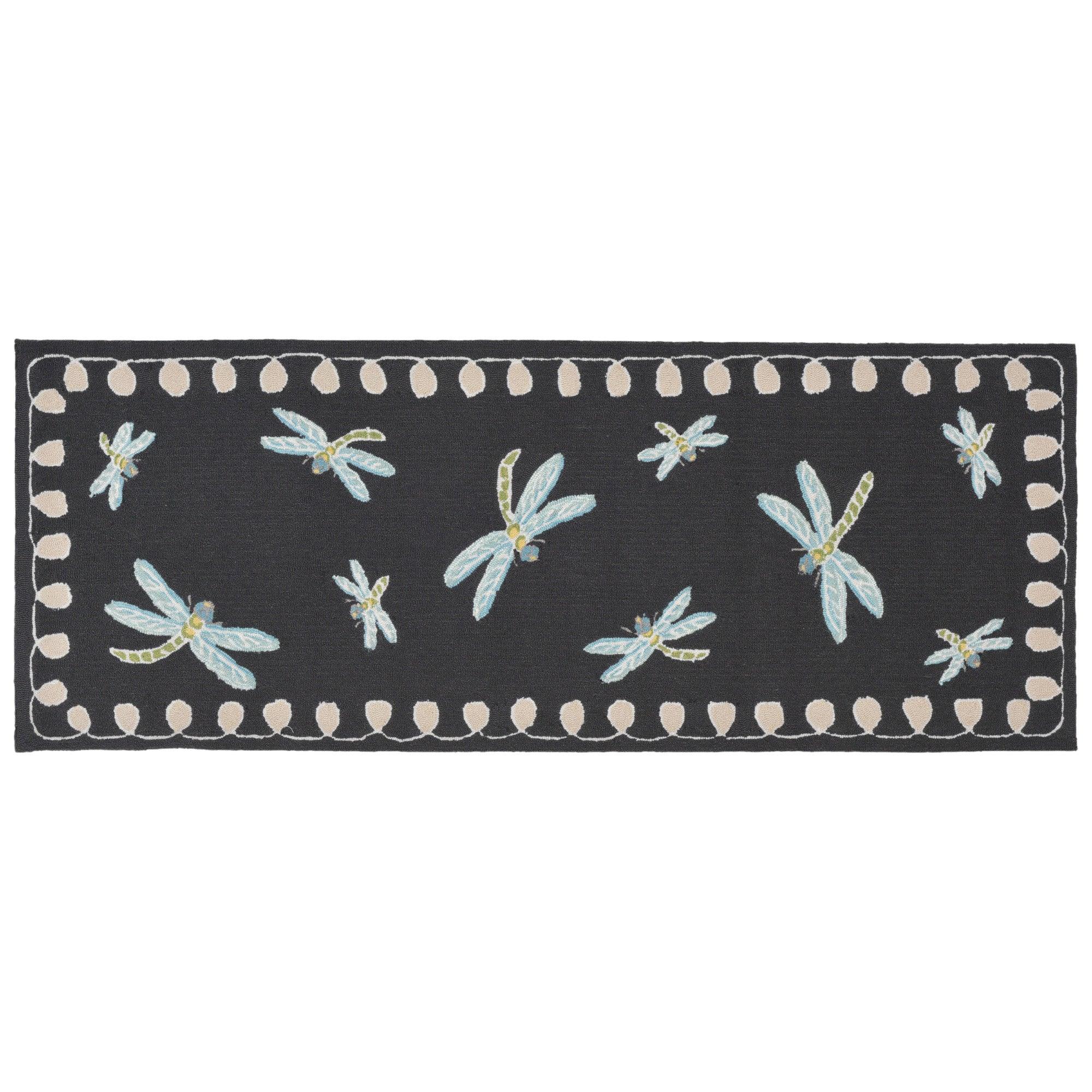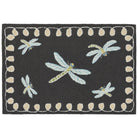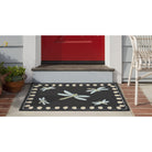 Frontporch Dragonfly Black, a charming and modern decorative mat that will instantly elevate your space. This whimsical design showcases a beautiful dragonfly motif with a stylish border, creating a vibrant and sophisticated look. The rich blend of colors adds depth and energy to the playful design, all in a sleek black color palette.