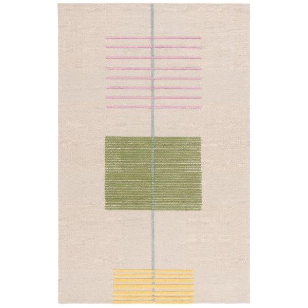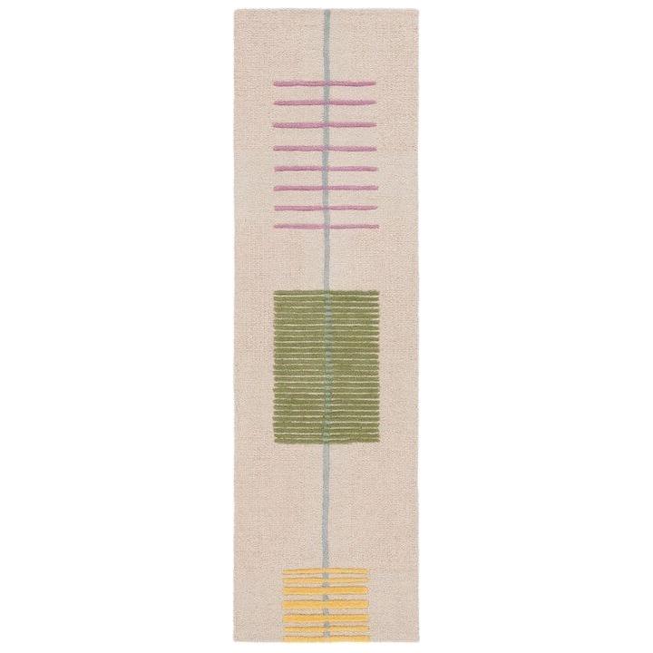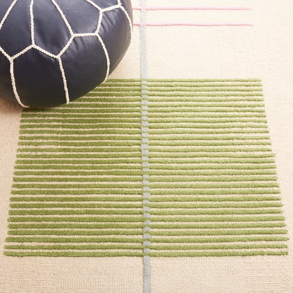 charming Genre GRE204B Beige Green rug, a delightful addition to your home decor. The Genre rugs effortlessly blend whimsical designs and vibrant colors reminiscent of Americana and country fair style. Crafted with care, these rugs are hand-tufted using premium wool to create a soft and cushioned loop pile that adds warmth and character to any classy-casual room setting.