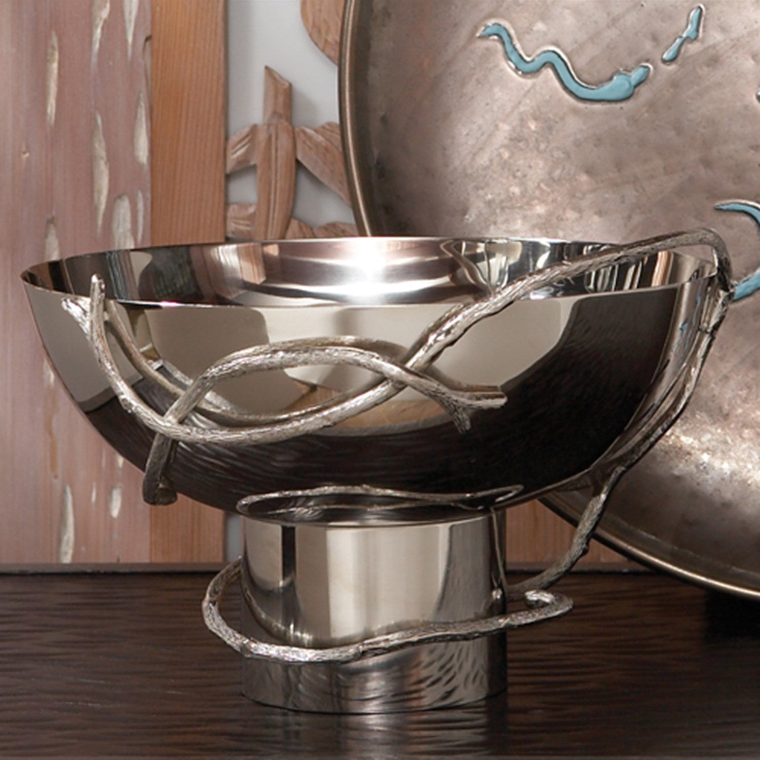 Textured nickel twigs wrap around a tonal bowl creating our Nickel Twig Bowl. A beautiful centerpiece for any table.