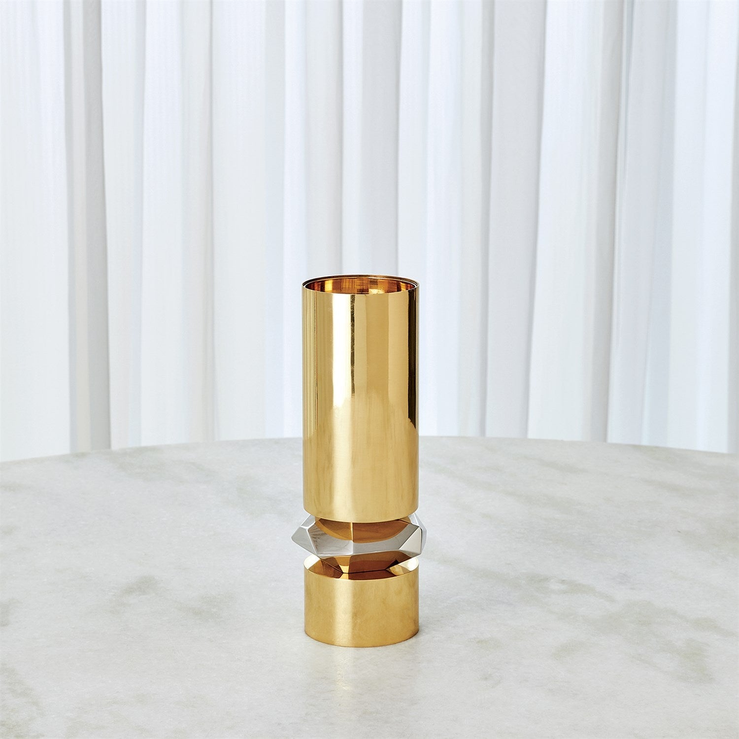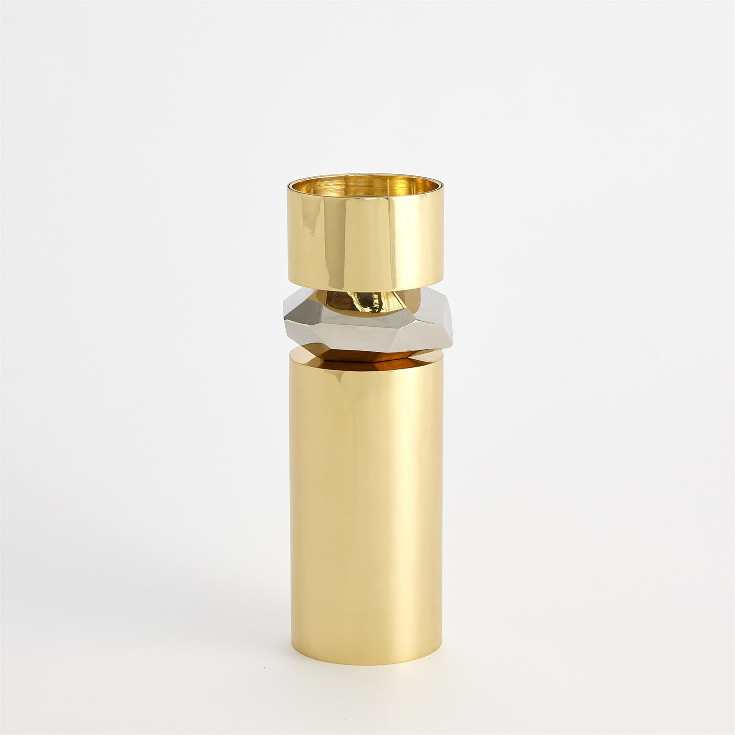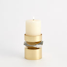 The Romano Brass Candle Holder is made of shiny brass and nickel-plated brass. Holds 3 inch pillar candle.