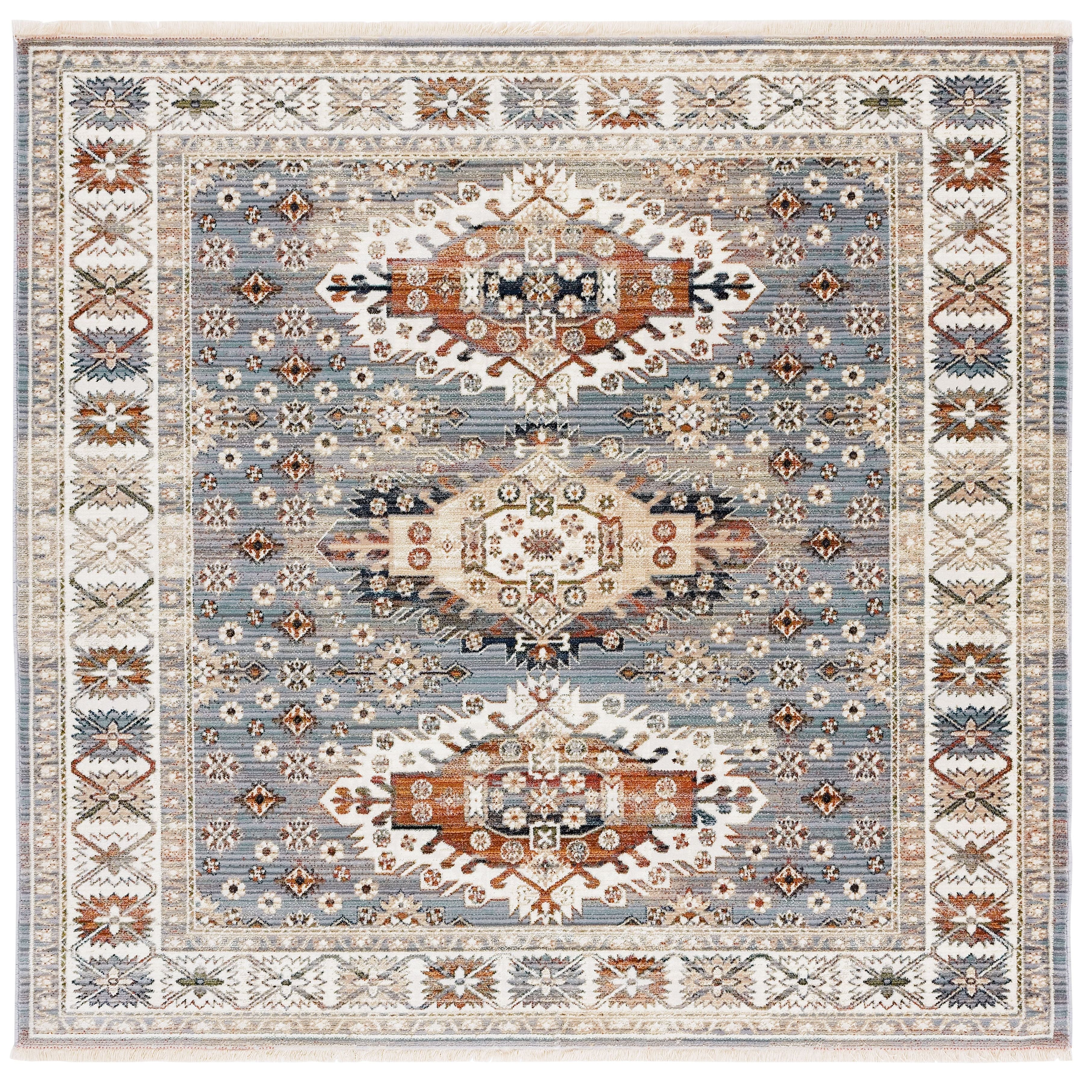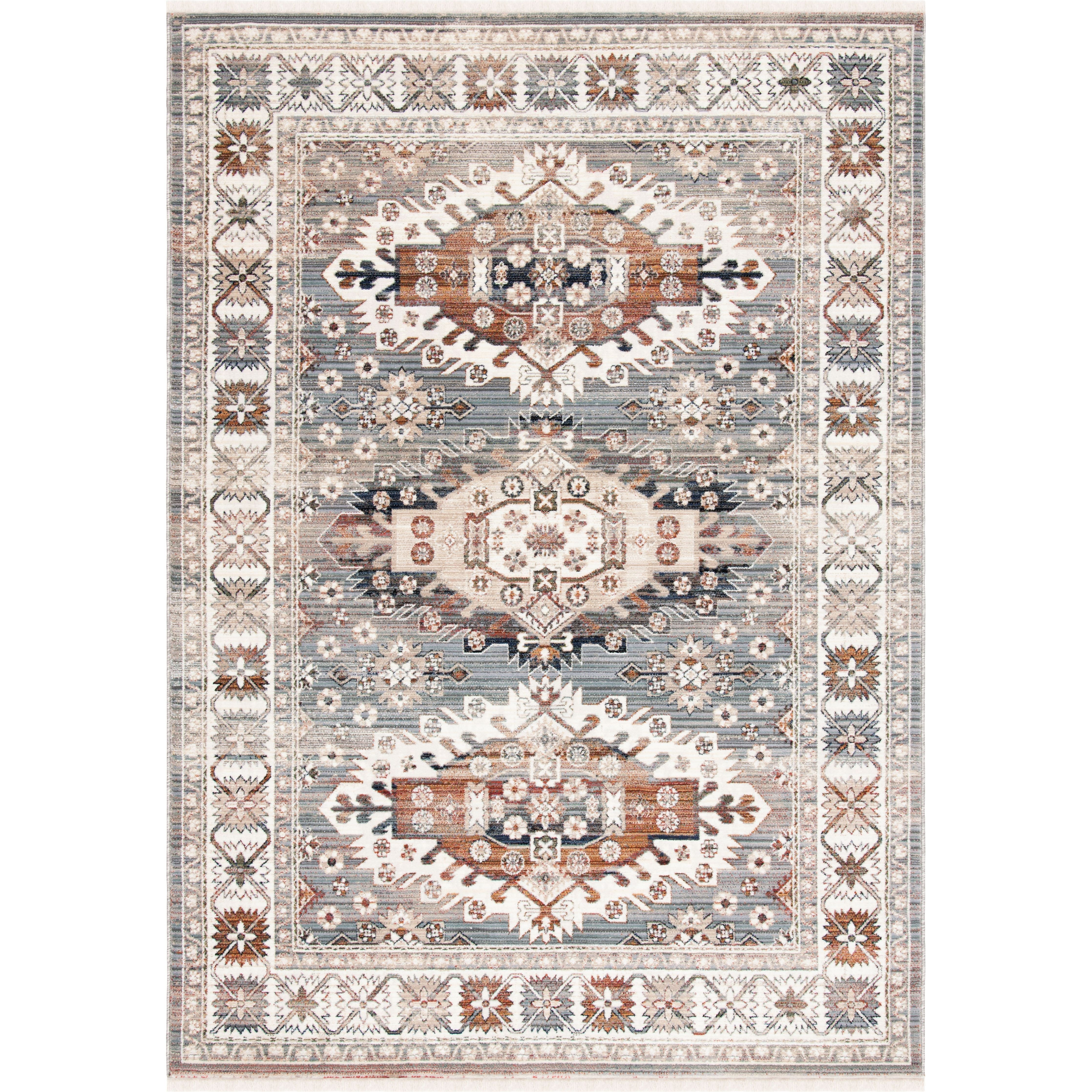 Herat HRT355G area rug, a stunning blend of traditional Herati rug motifs and modern durability. These rugs feature intricate Oriental patterns in classic colors, adorned with elegant medallions and floral palmettes for a touch of timeless charm. Ideal for any space in your home, whether it's the living room, dining room, or bedroom, these rugs are finished with stylish fringe details that echo designs from centuries past.