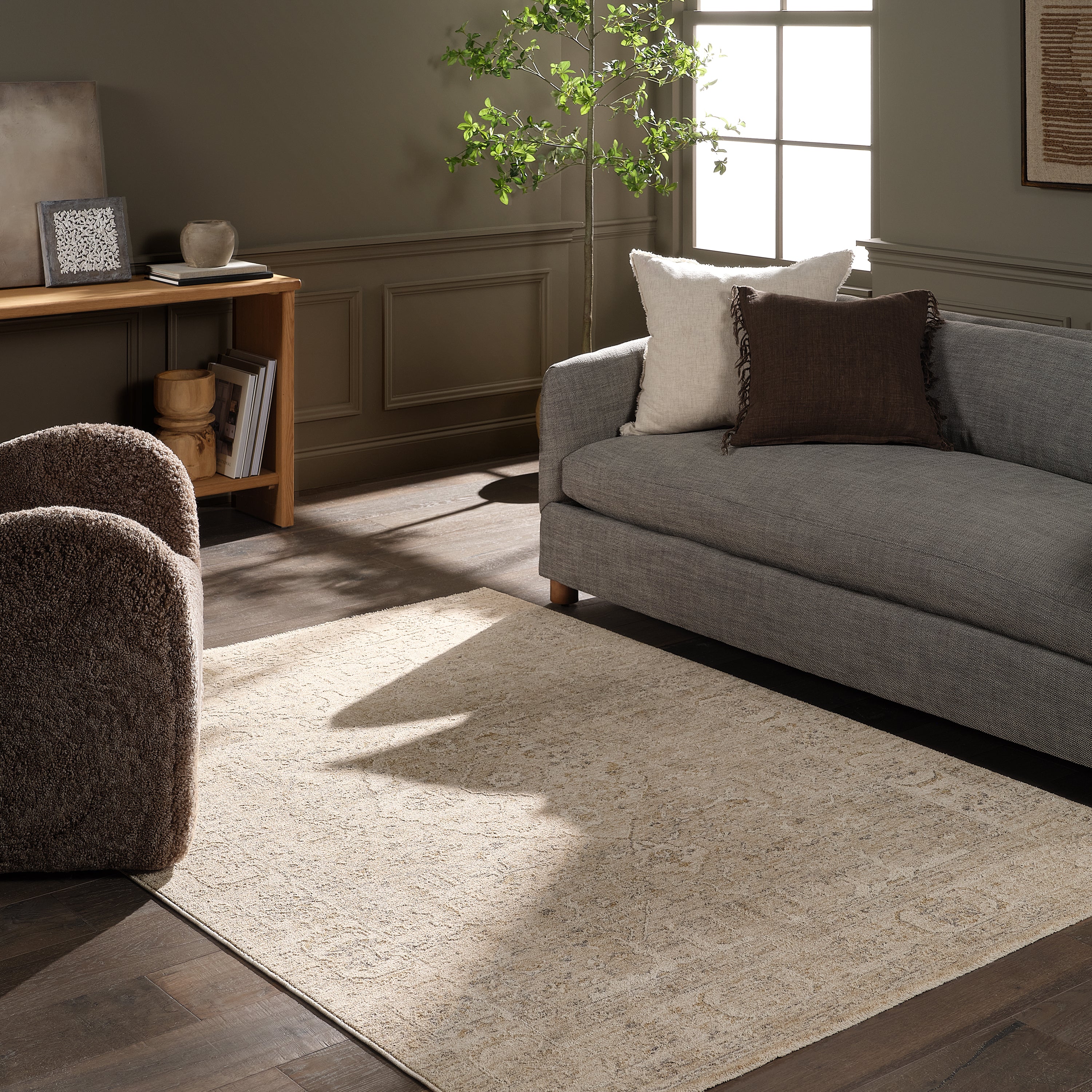 Elegant and classic, the Aslan design presents a largely sought-after Tabriz-inspired pattern in a durable, powerloomed construction. The beautiful tan and gray medallion pattern effortlessly elevates any medium-traffic indoor setting. Space-dyed polyester introduces subtle, intriguing color variation, while the cross-woven fringe detail adds a touch of texture and visual interest. With a soft, velvety feel that’s easy to care for, here’s refined living made easy.