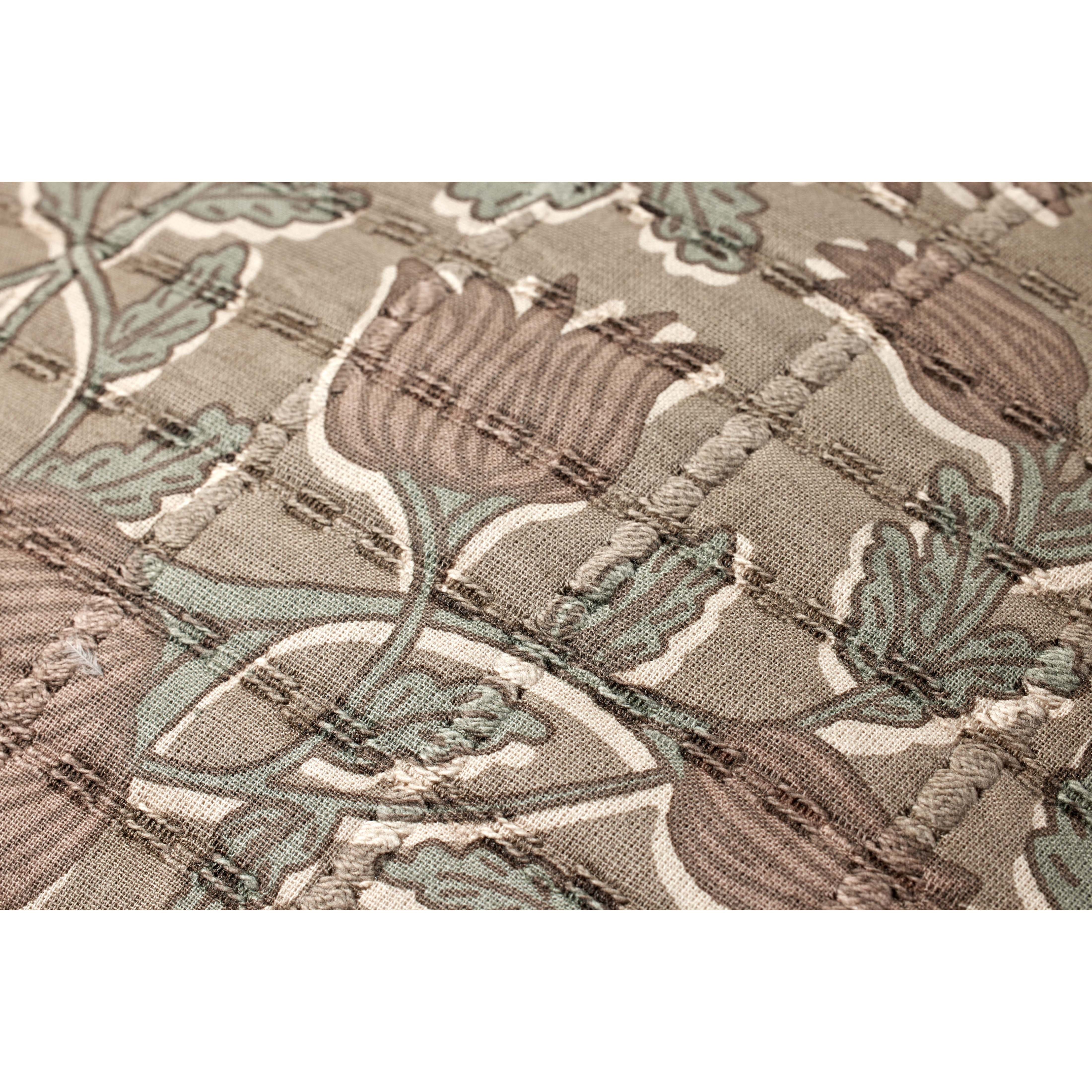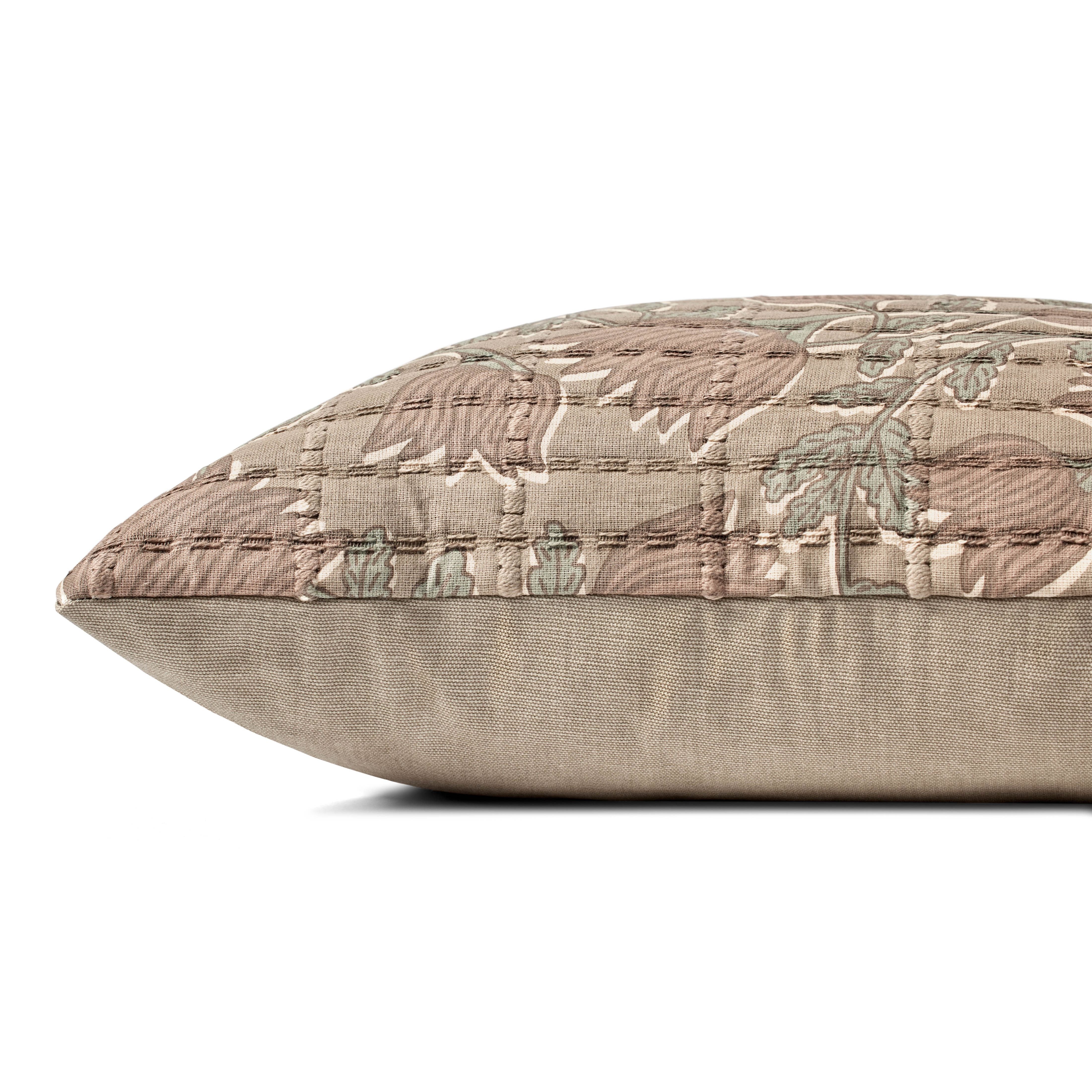 This elegant throw pillow from Jean Stoffer x Loloi features a muted taupe and rose-toned floral pattern with a soft quilted texture. The pillow cover is made of cotton and measures 18” x 18”, a standard size to style in living rooms and bedrooms.