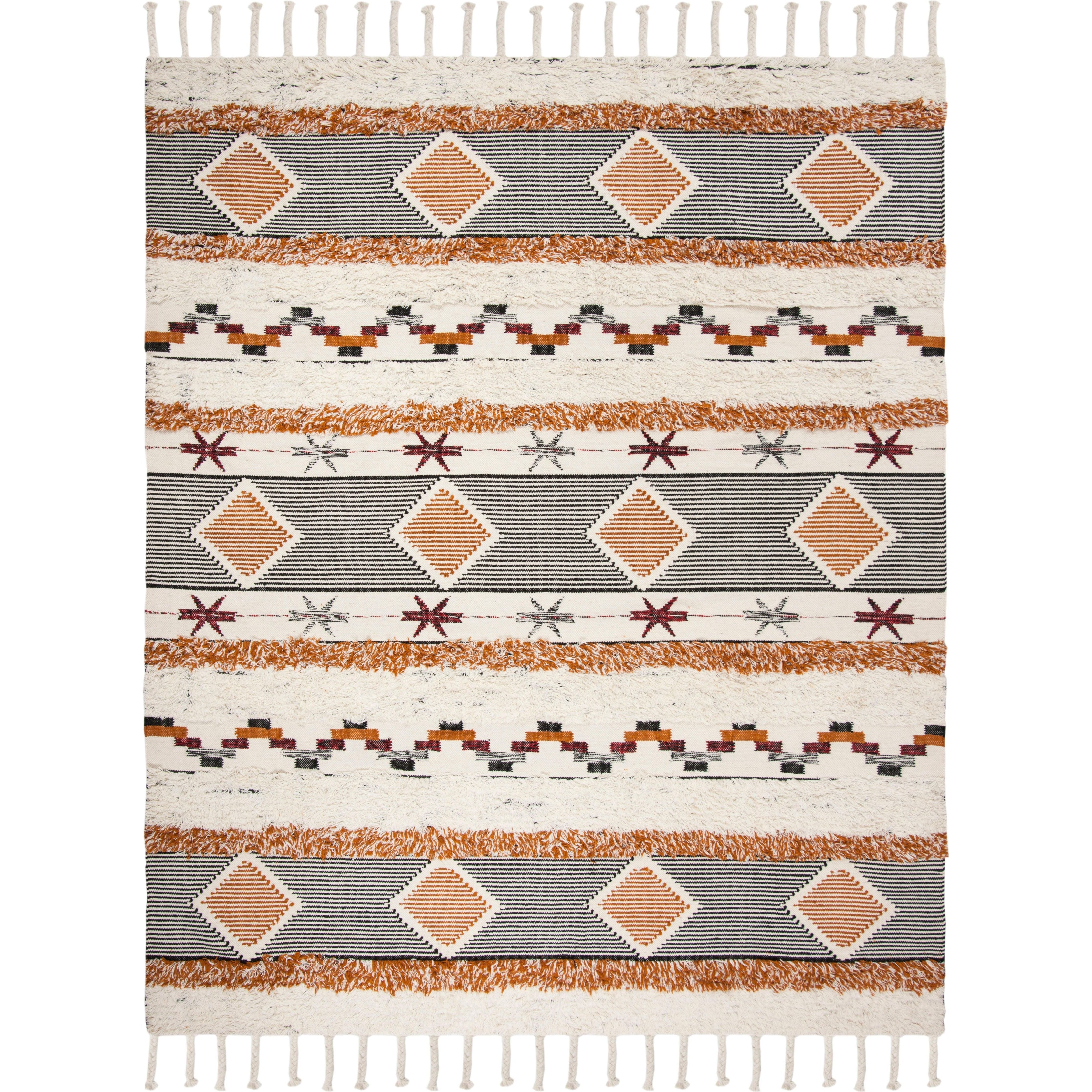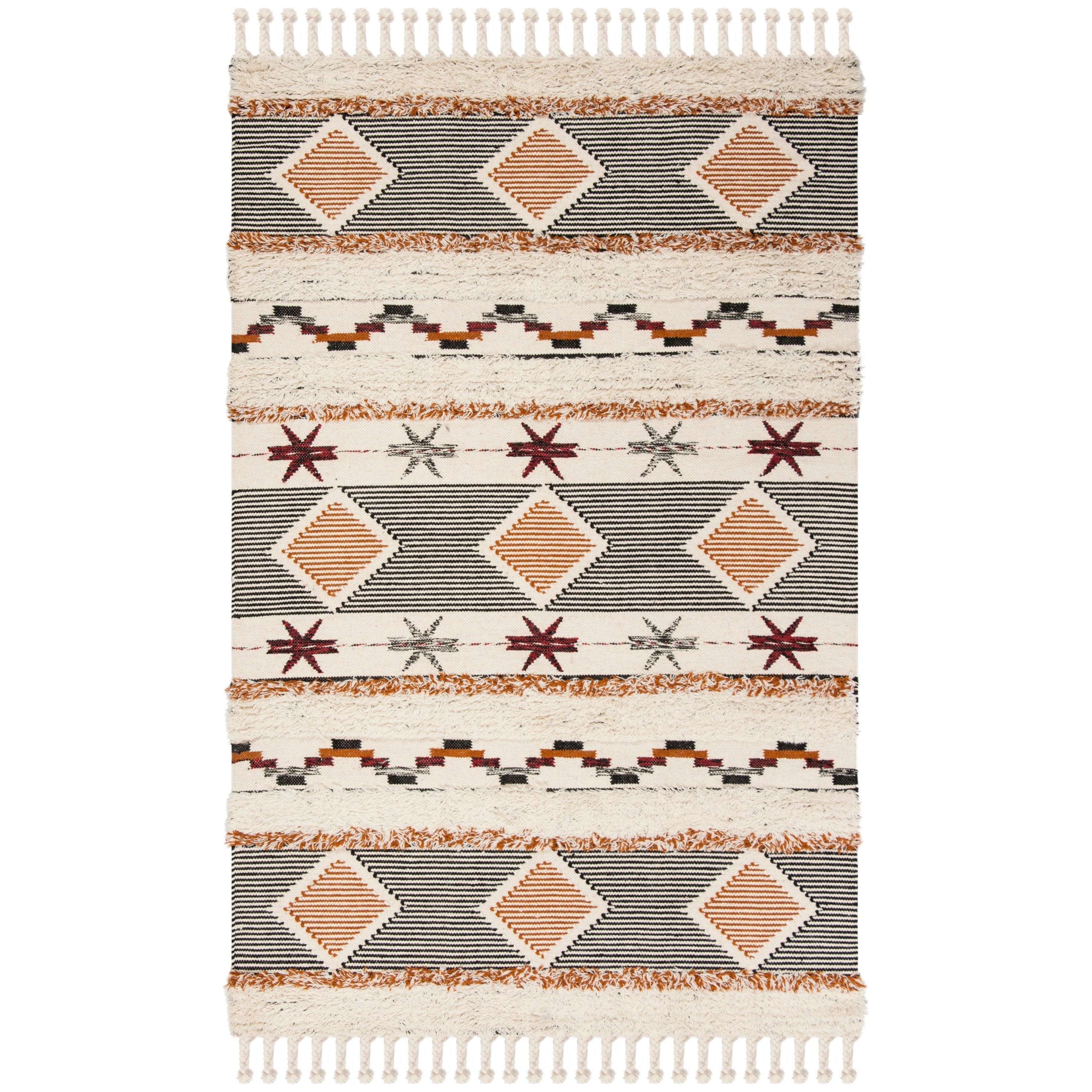 Elevate your home decor with the Kenya KNY904A Ivory Black Orange Rug from the Kenya Rug Collection. Featuring captivating tribal designs, luxurious textures, and modish colors, this handmade rug is sure to become the focal point of any room. Made from pure wool with over-stitched cut pile yarns, the Kenya Collection offers a unique tribal complexion that adds character to your space.