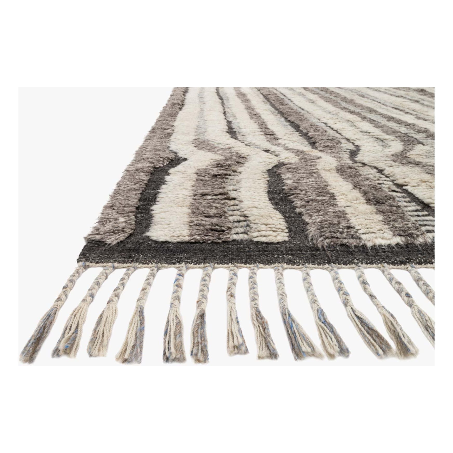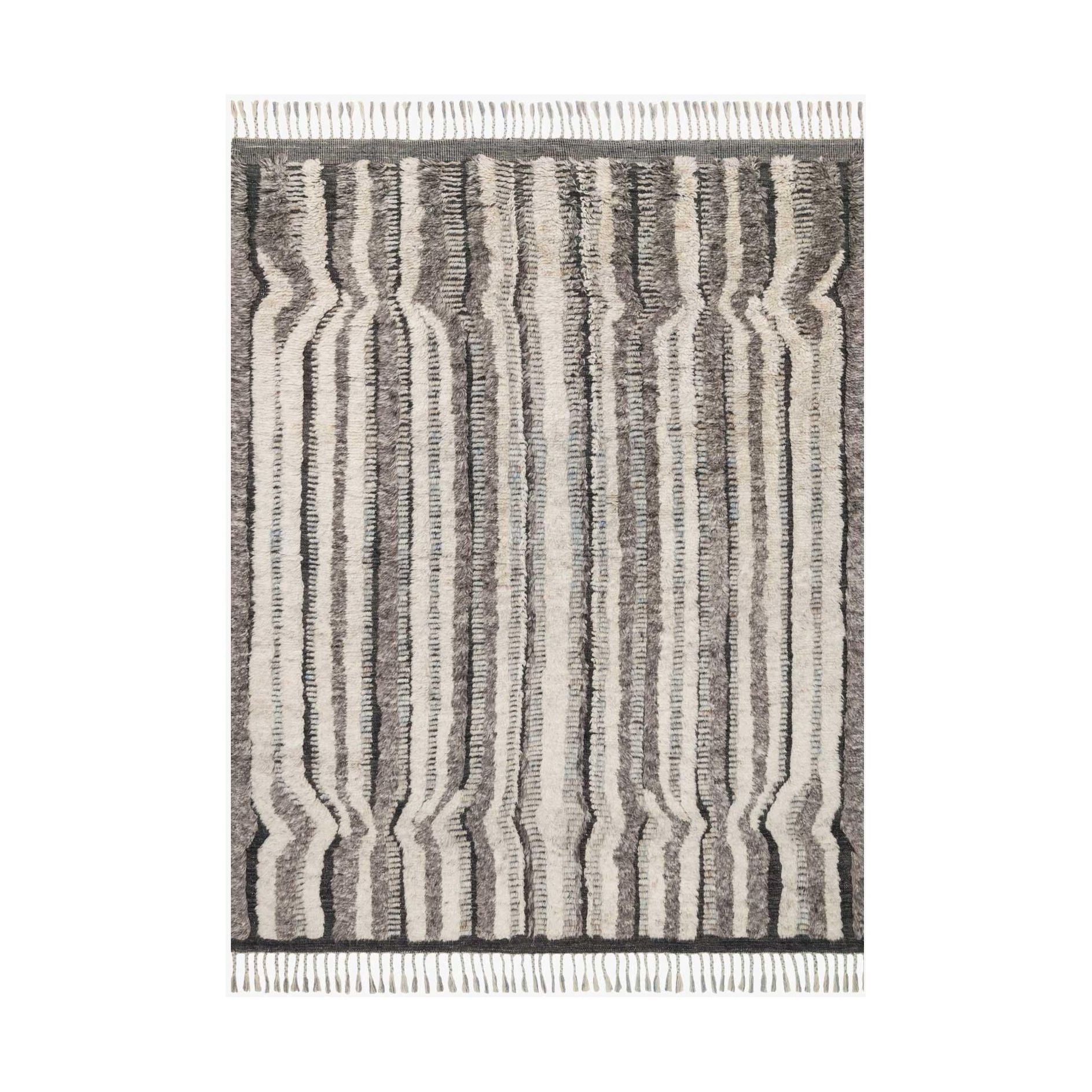 Khalid KF 03 Stone Charcoal, a stunning piece inspired by classic Moroccan design. Hand-knotted in India by expert artisans, this rug from the Khalid Collection boasts a luxurious soft pile crafted from 100% natural and undyed wool. The unique material lends a beautiful variation in tones to each rug, ensuring that every piece is truly one-of-a-kind. To enhance its authentic look, the rug is elegantly finished with a carefully designed fringe detail.