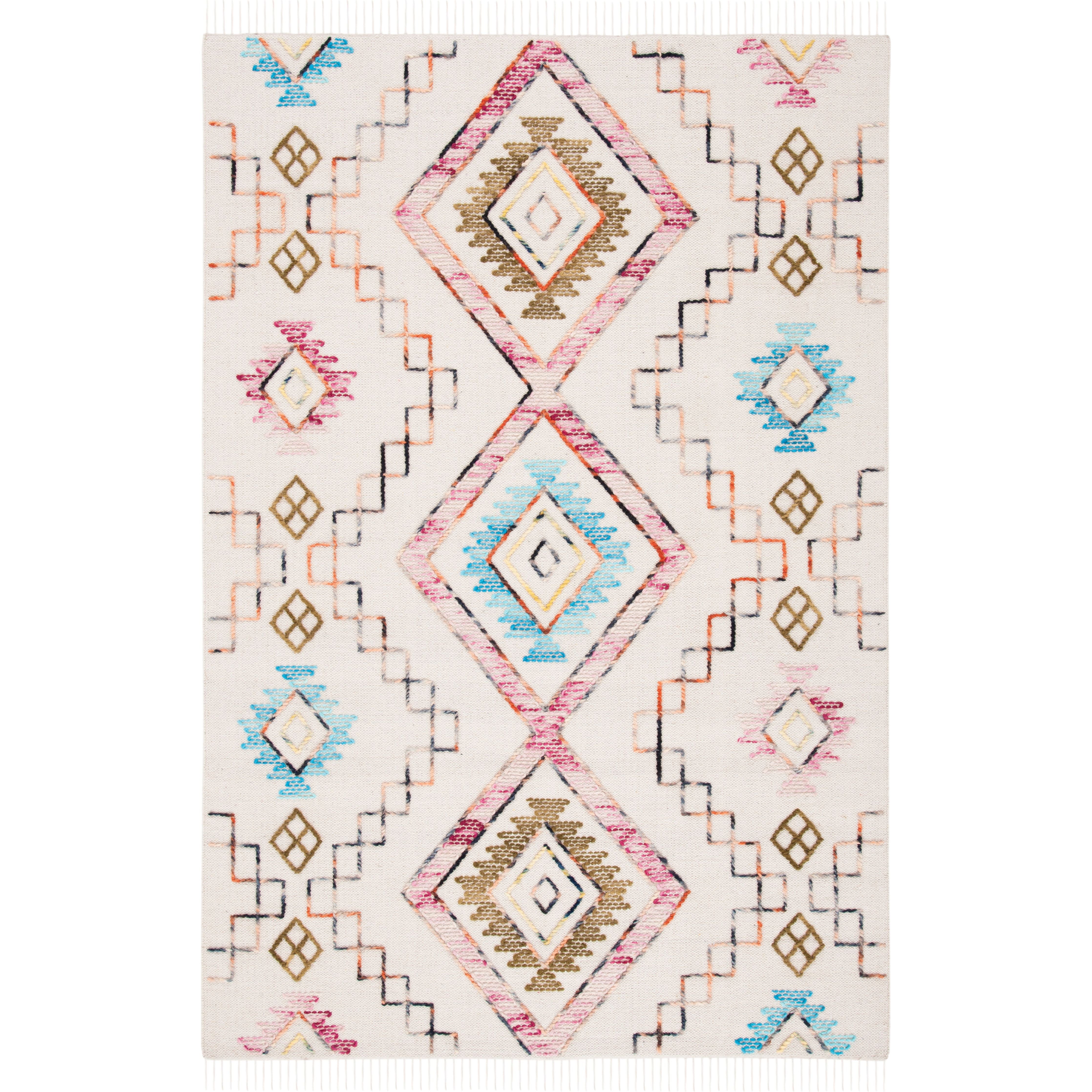 Kilim KLM525A by SAFAVIEH, a stunning bohemian flat weave area rug that adds an artistic touch to any space. Handmade using traditional techniques passed down from nomadic communities in the Middle East and Central Asia, these Kilim rugs showcase vibrant tribal-inspired designs and bold colors that instantly elevate your home decor.