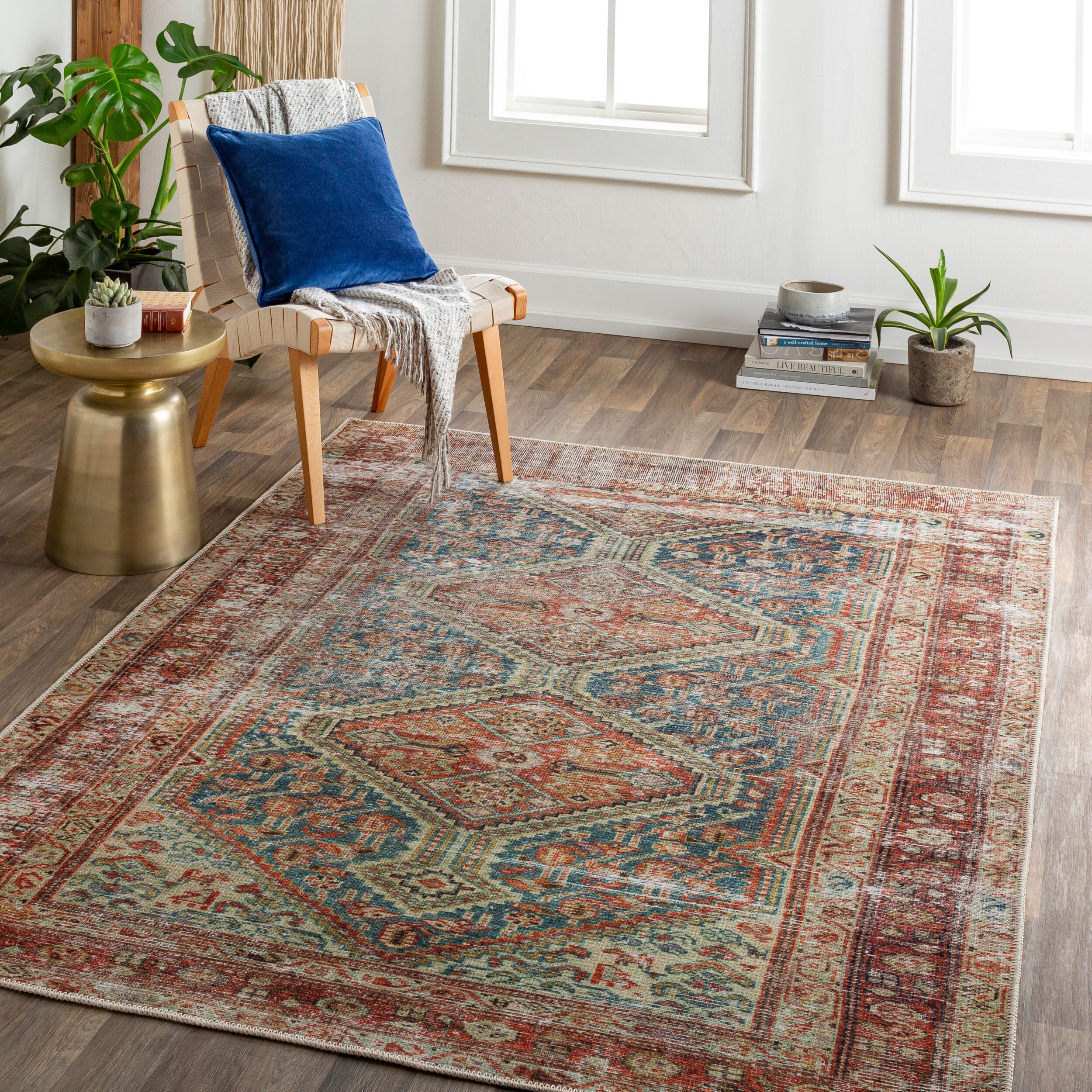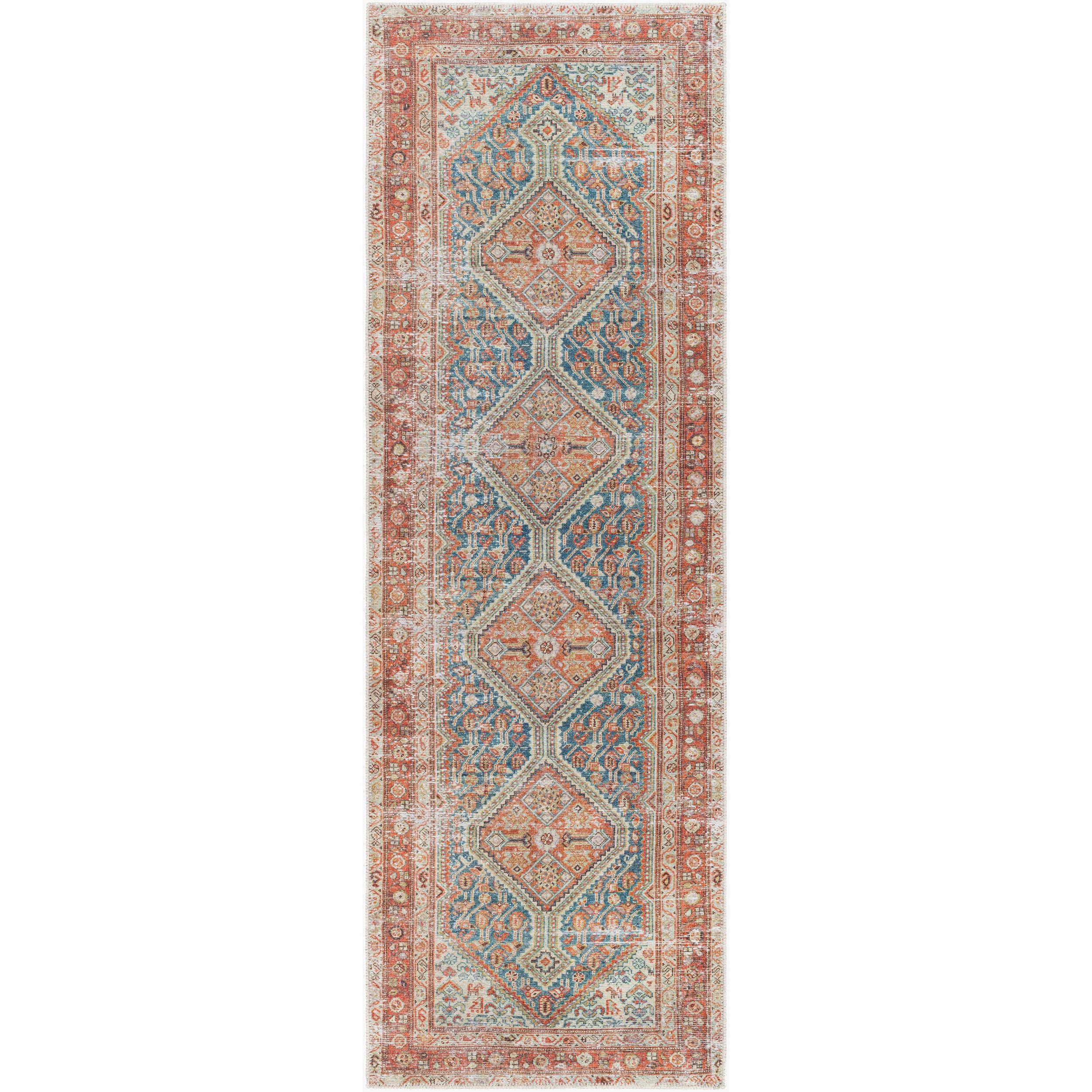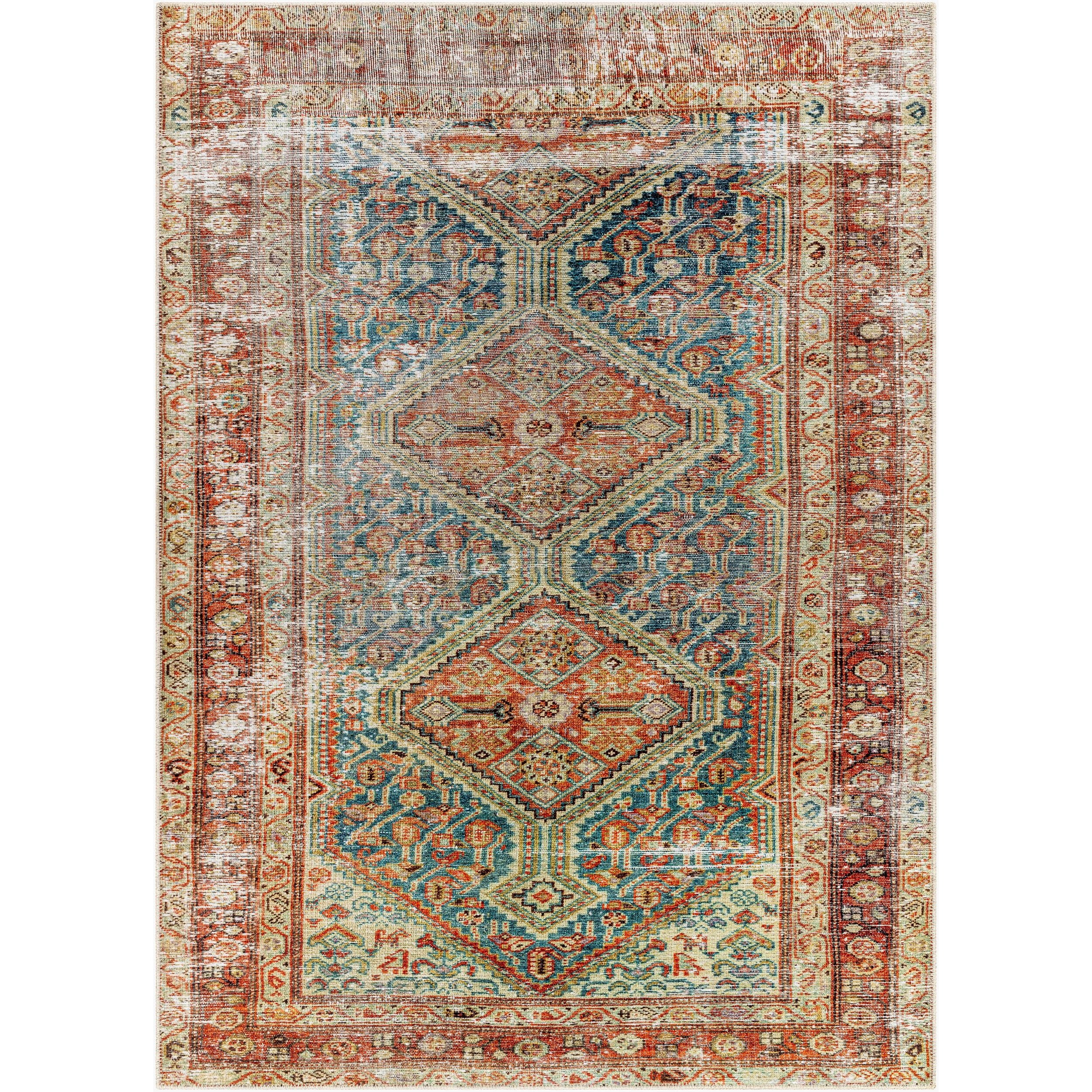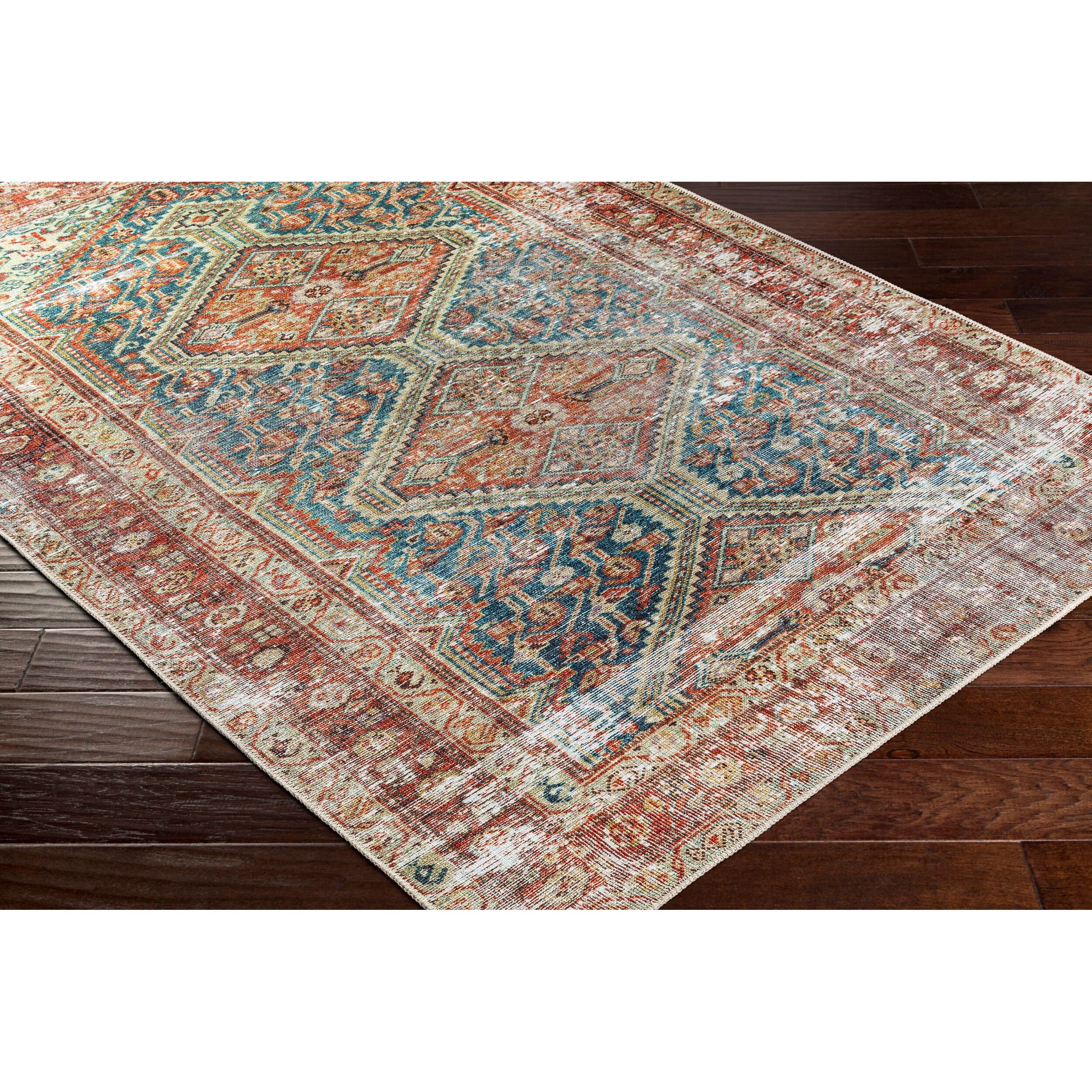 Detailed Colors: The prominent colors in this rug are: - Rust - Teal - Ivory - Midnight Blue - Sage