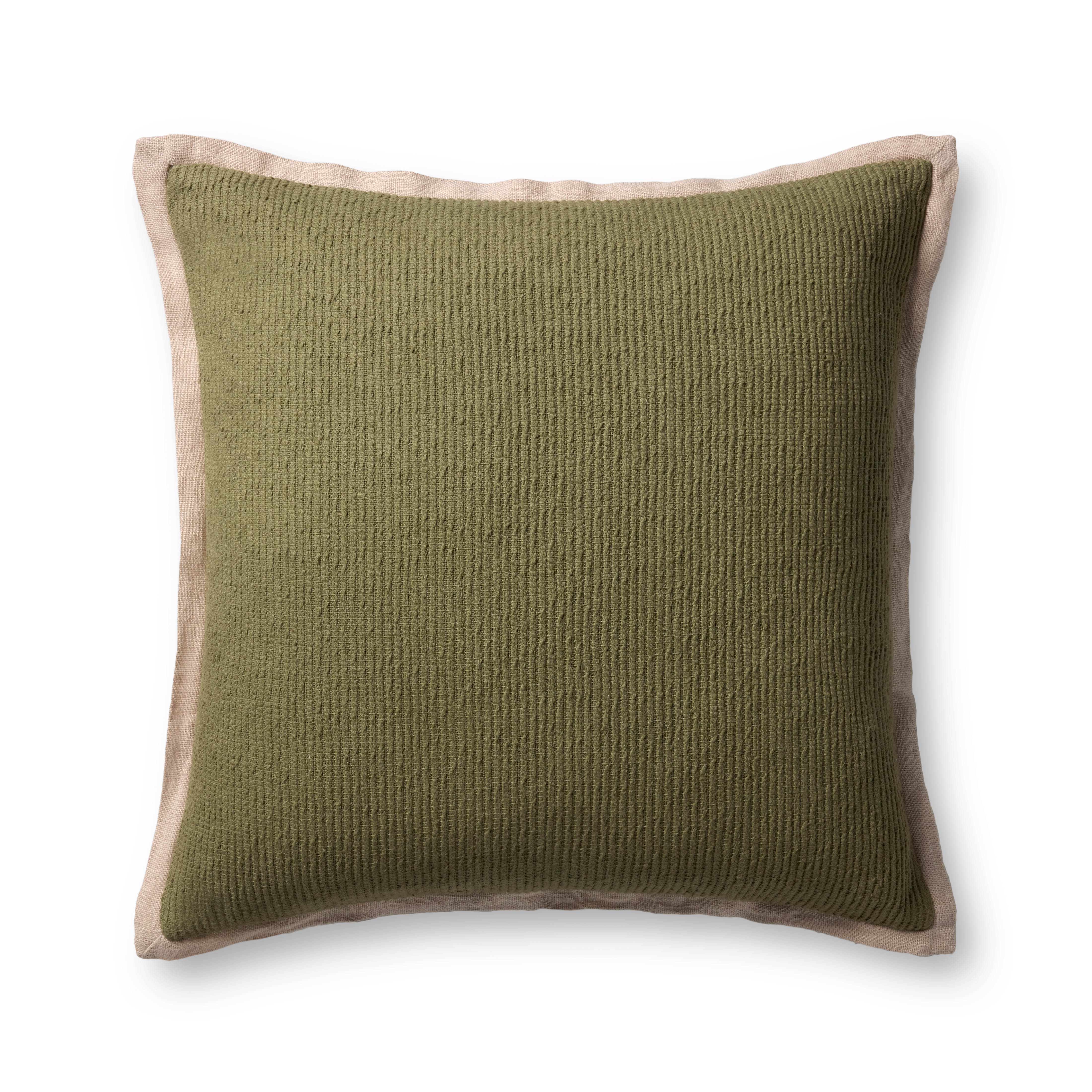 This light sage green throw pillow with beige flange edges adds a nubby, cozy texture to your home decor. The accent pillow is a versatile layering piece for living rooms, bedrooms, and more. The 22” x 22” square pillow is woven in India of cotton and other fibers.