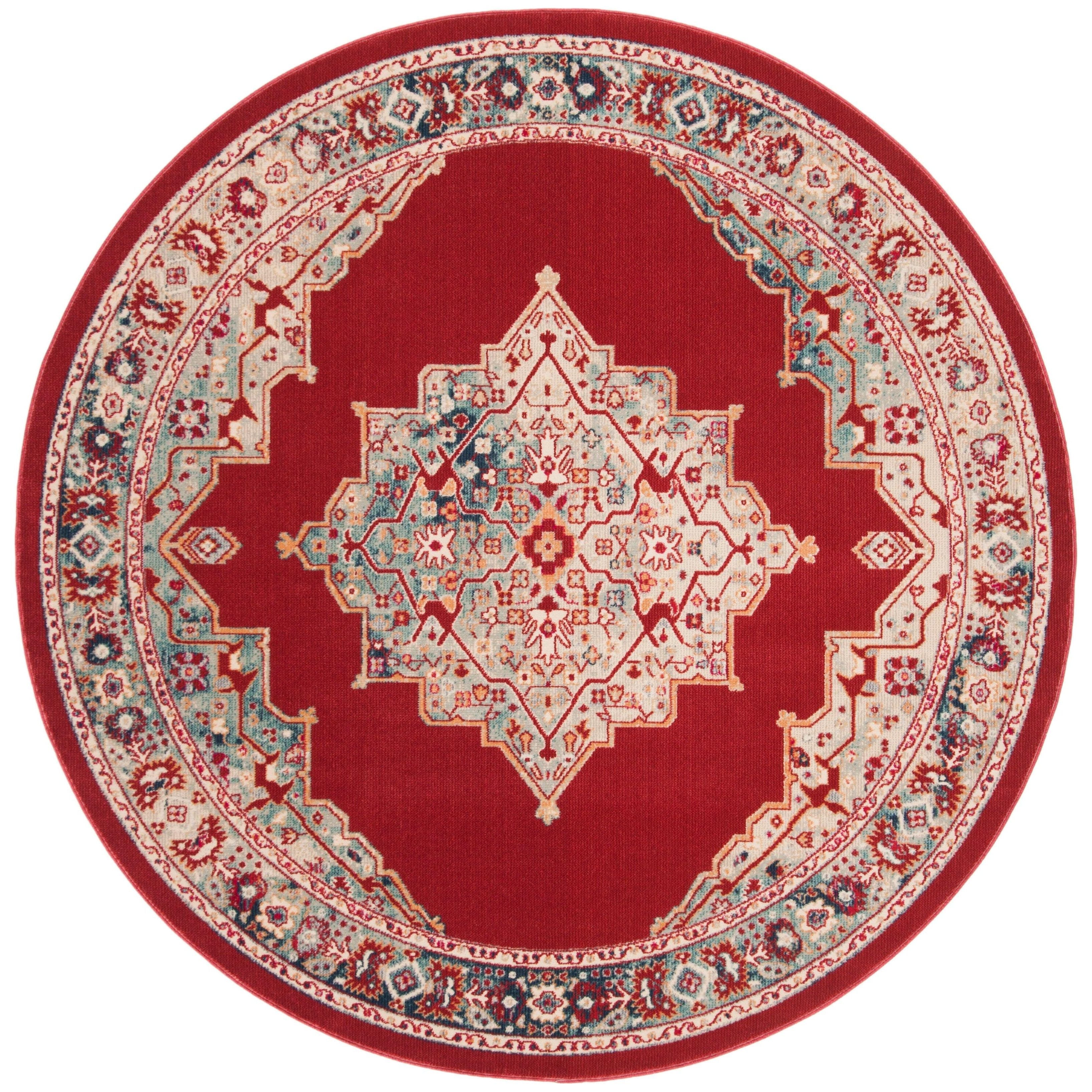 Merlot 300 MER312Q Red Aqua, a stunning addition to Safavieh's Merlot collection. This area rug showcases ornate traditional motifs with a modern twist, featuring vibrant colorways that add an illuminating touch to any room. The bohemian flair and distressed design bring character and charm to your living space, creating a lively atmosphere.
