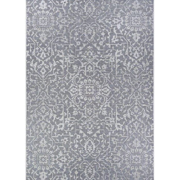 Monte Carlo Palmette Grey Ivory rug, a versatile addition to your indoor or outdoor space. Crafted from 100% Fiber Enhanced Courtron™ Polypropylene, this rug boasts a structured flatwoven construction that ensures durability and style. Its UV stabilization makes it ideal for outdoor use, while its mold and mildew resistance provide extra peace of mind.