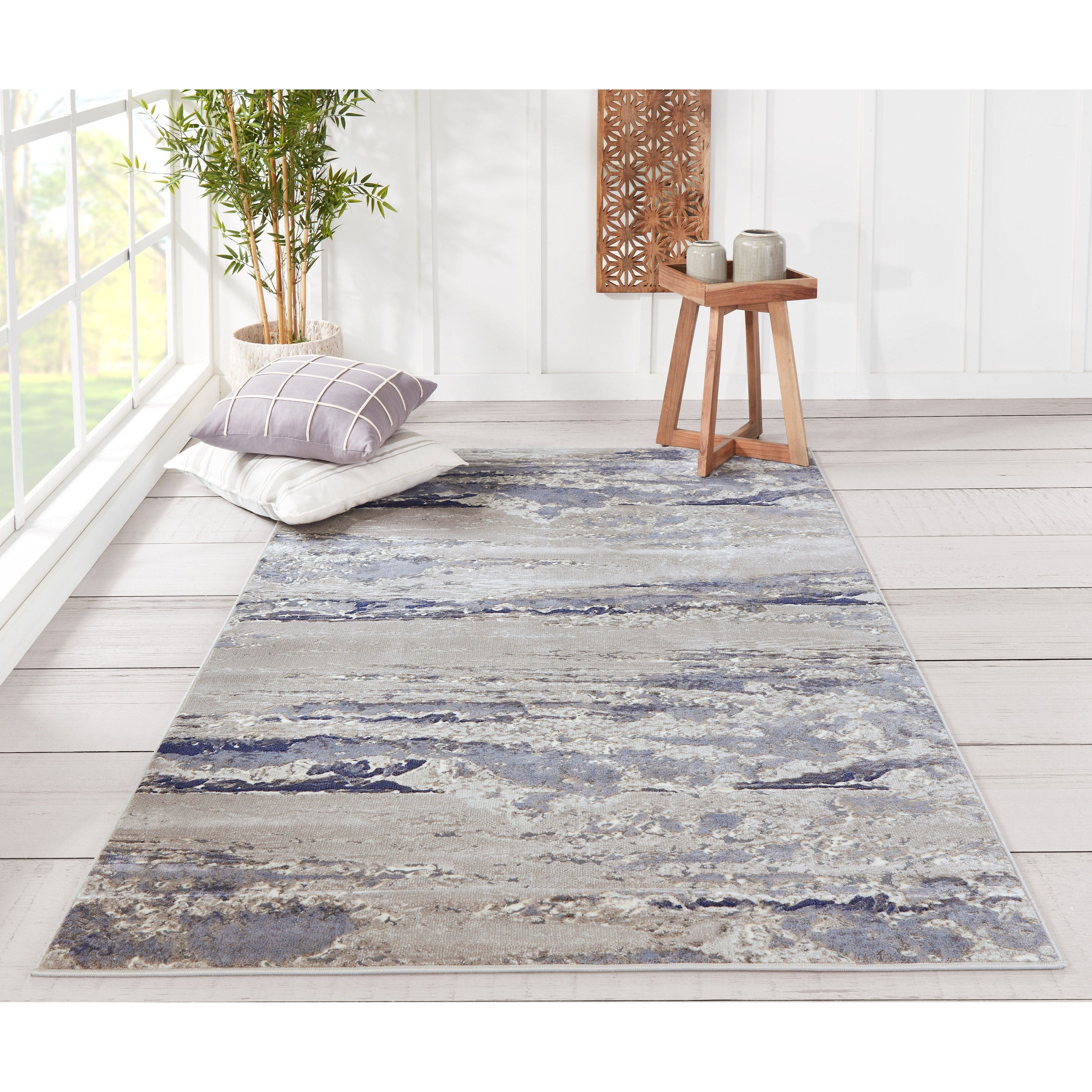 Monterey Mo 08 Blue area rug - a perfect addition to modern interiors. The rug features abstract gestures that are in line with today's contemporary trends. Splattered streaks and striations create a unique design reminiscent of paint on canvas, with shades of blue, brown, red, and teal adding depth. The patterns range from traditional Persian motifs to transitional trellis designs, making this rug versatile for various decor styles.
