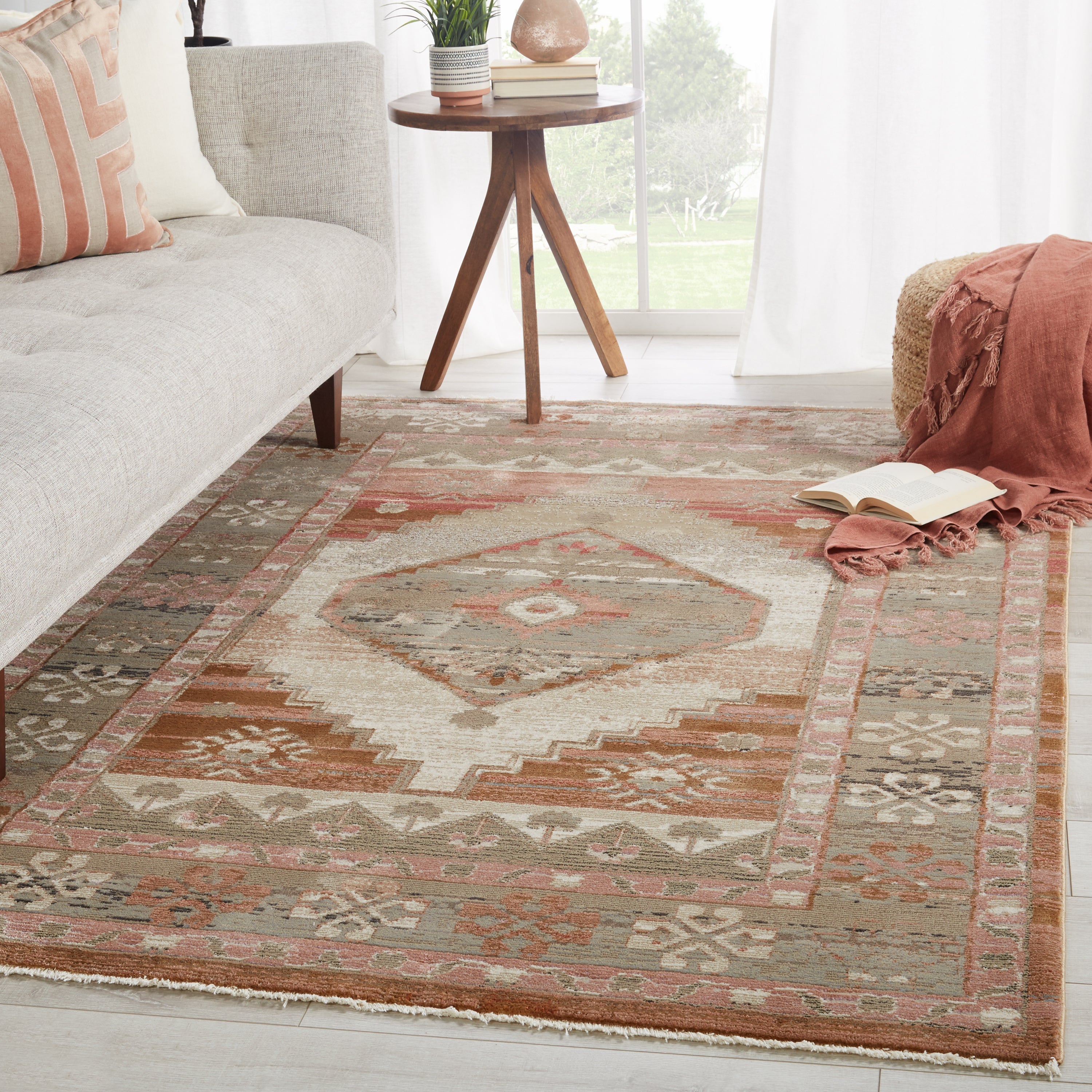 Myriad MYD09 Constanza rug, a stunning addition to your home decor. Inspired by the timeless beauty of sun-drenched Turkish patterns, this collection exudes warmth and charm with its faded yet rich color palette. The Constanza rug showcases a beautifully distressed tribal medallion in soft dusty pink, tan, and gray tones, accented by ivory fringe trim for a touch of elegance.