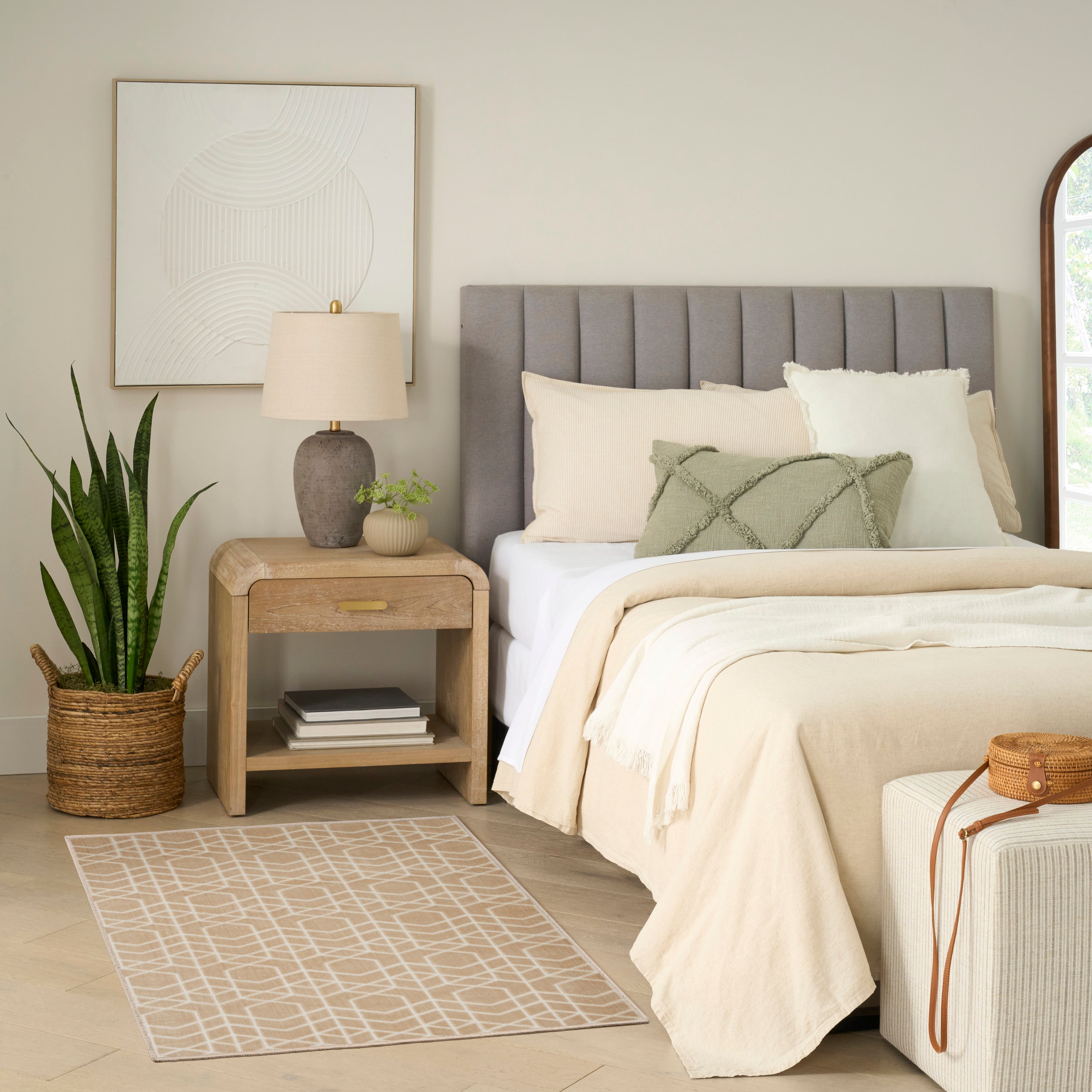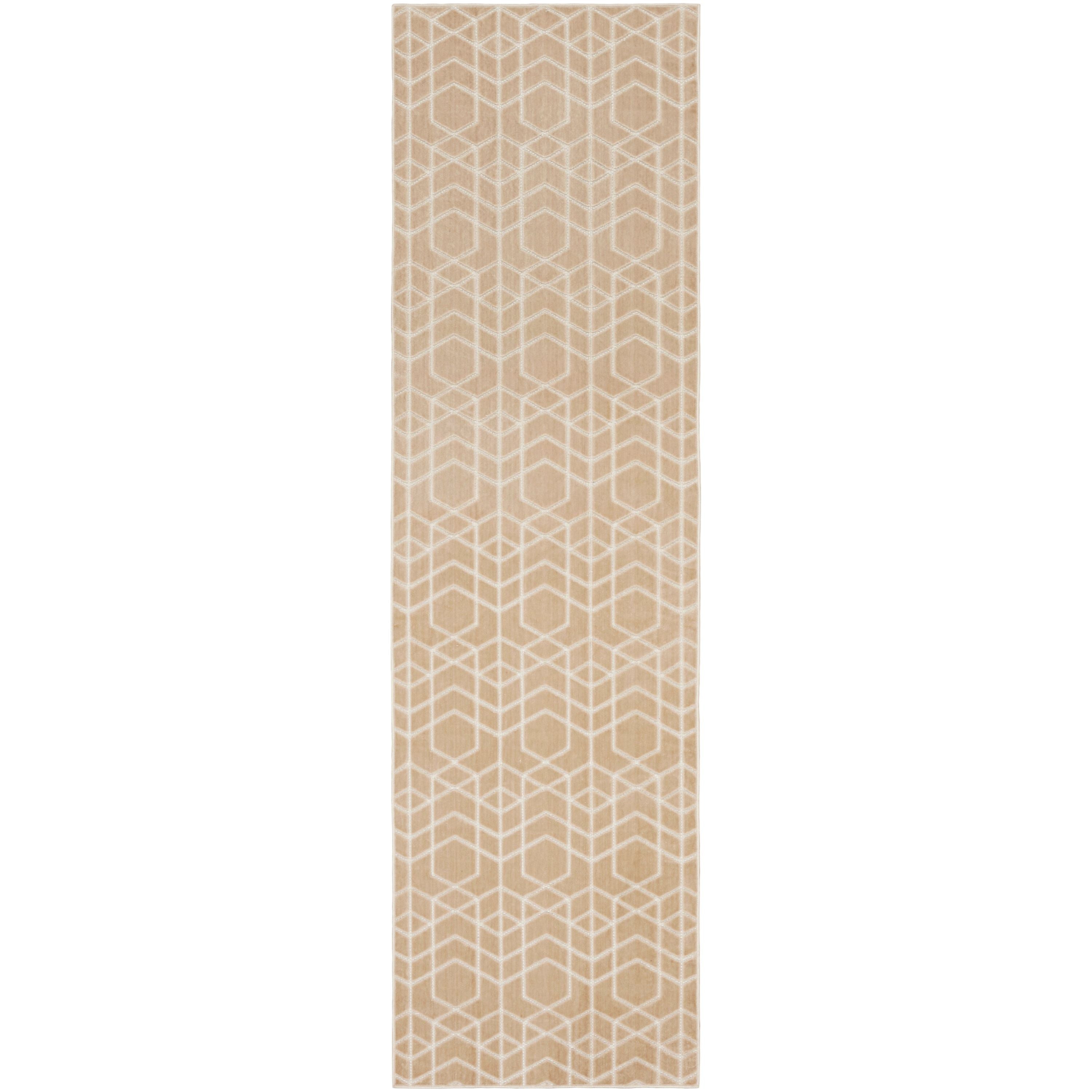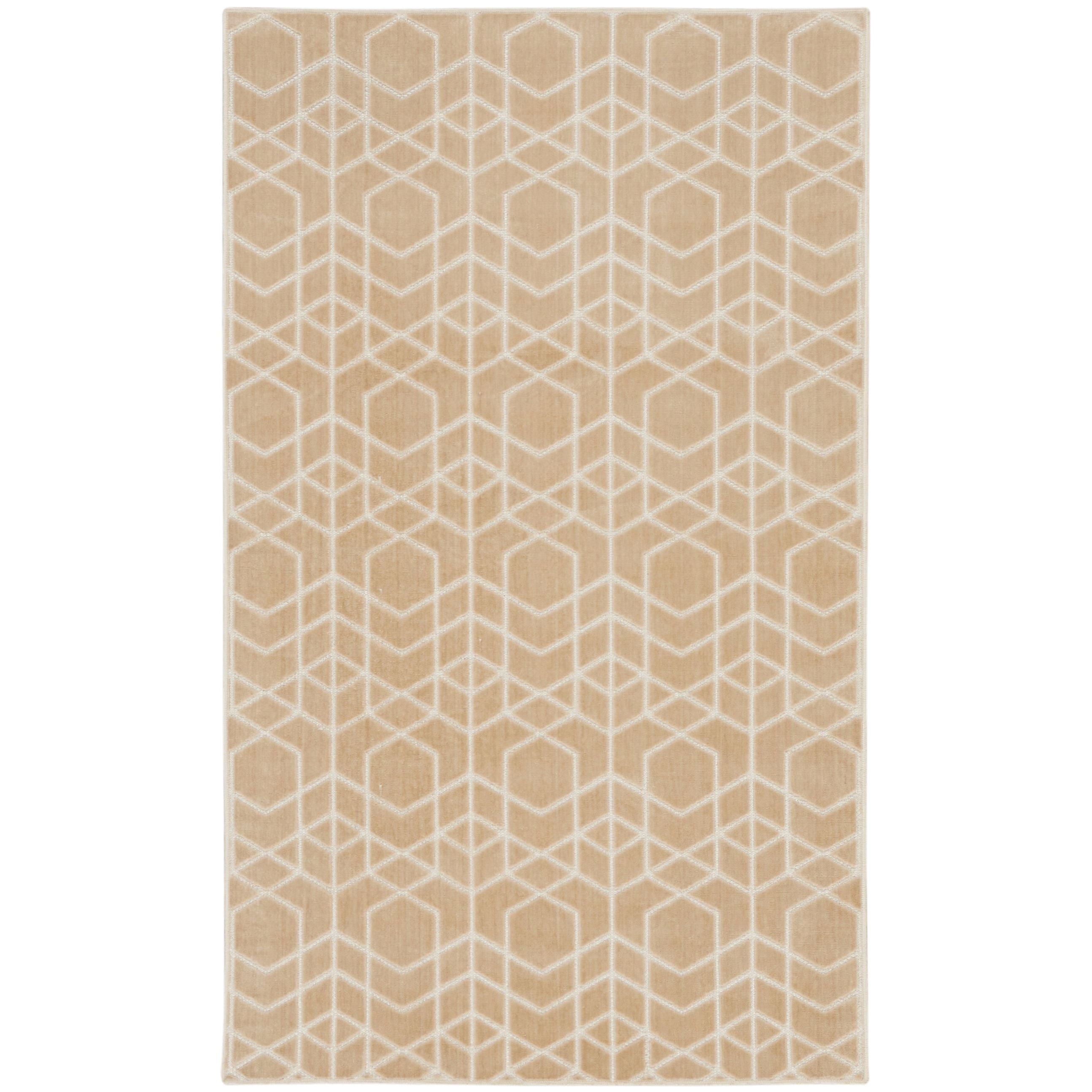 Enhance your space with the clean and modern look of this beige geometric rug from the Washable Charm collection. The crisp repeat pattern creates a mesmerizing effect, made even more stunning by a subtle high-low texture. Stylish and functional in a machine-washable, low-profile construction great for high-traffic areas.