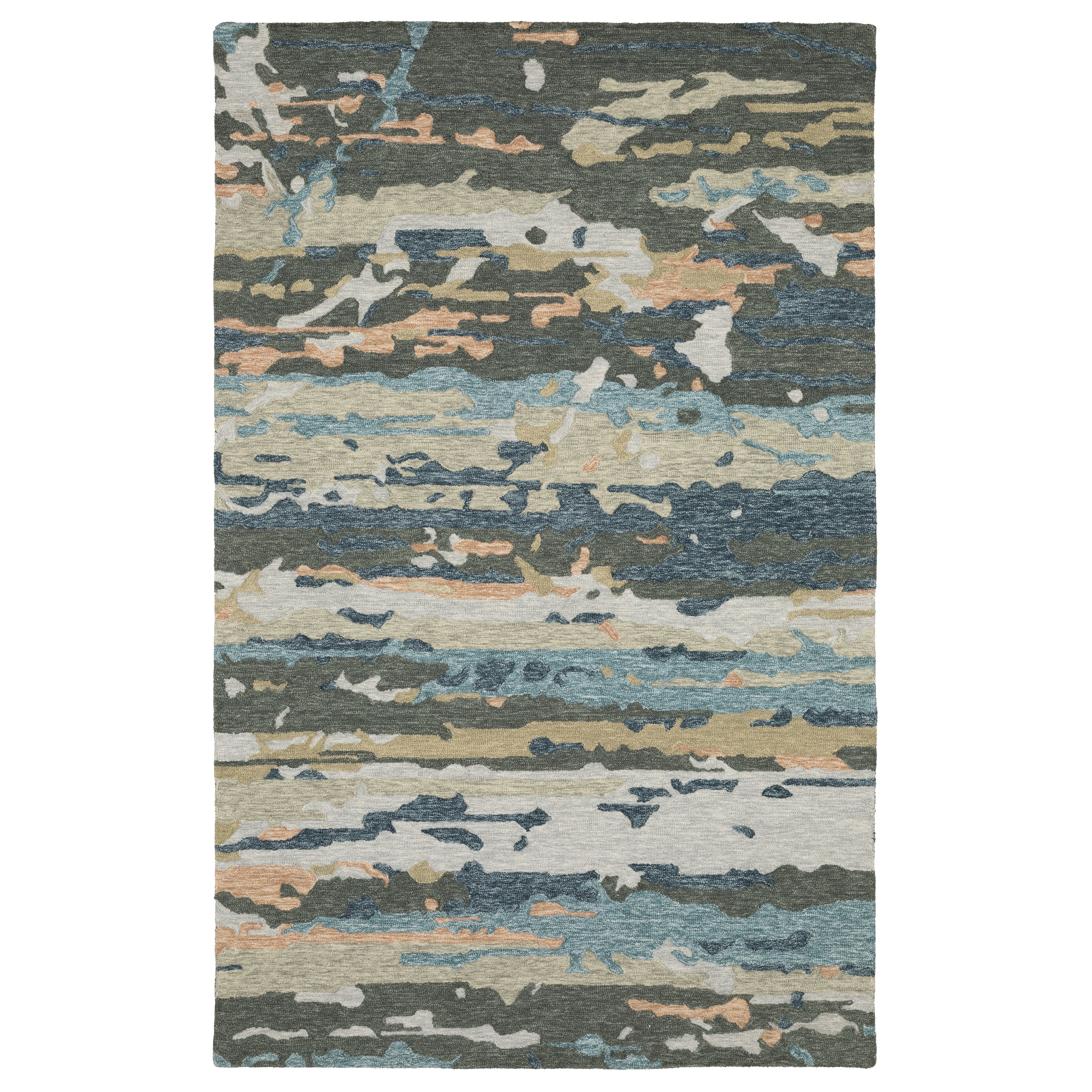 Kipton is a hand-tufted collection constructed of space dyed wool and features a dense, textural cut and loop pile. Designs recall the organic shifting and layering of natural elements over time and that idea is echoed in the softly saturated blue and green tones as well as warmer shades of copper and gold.