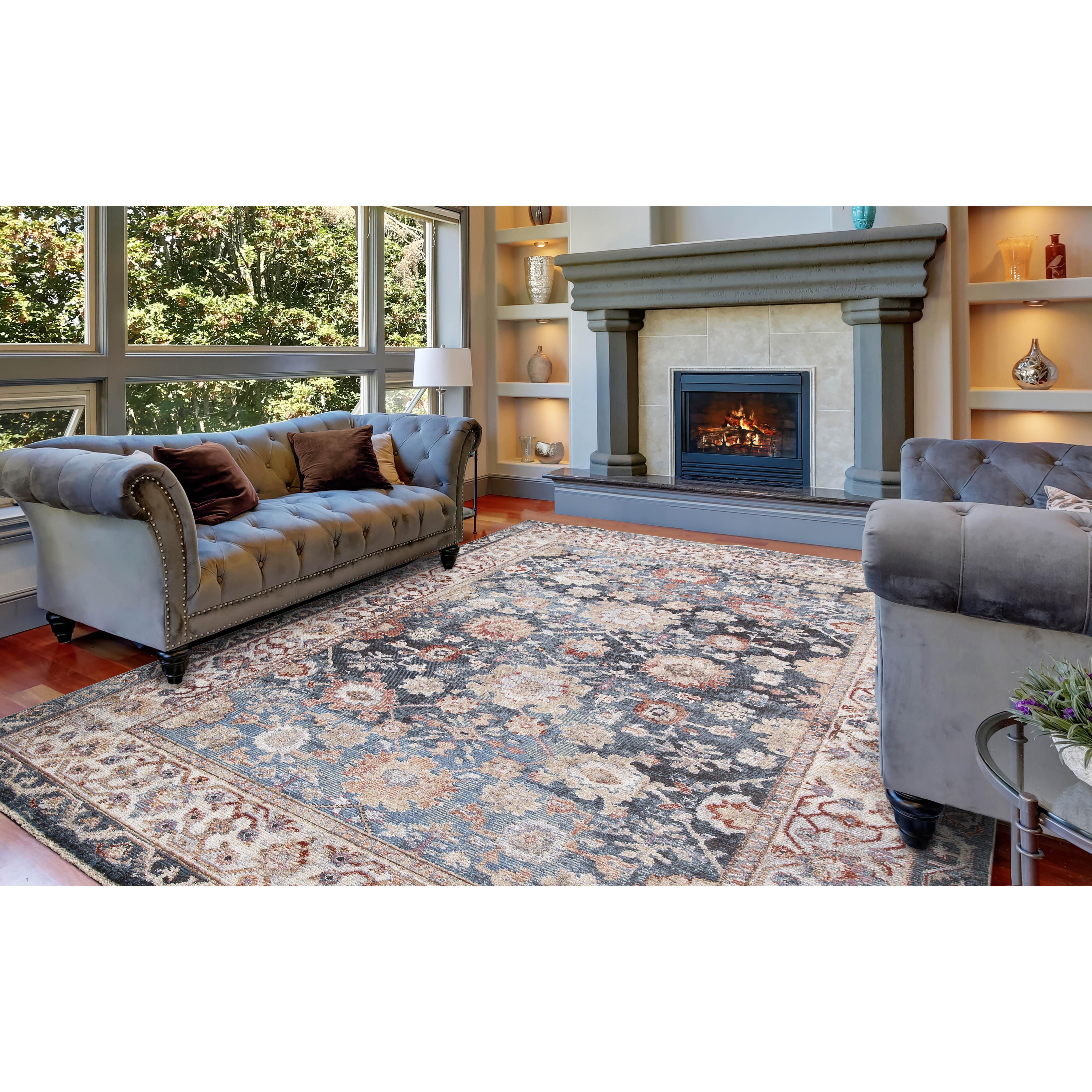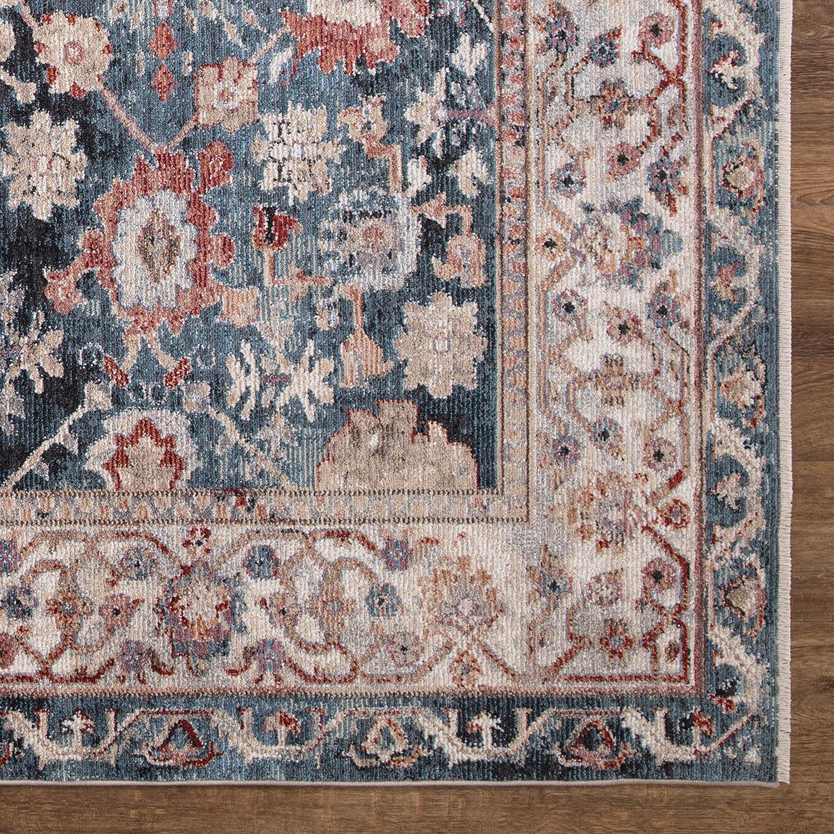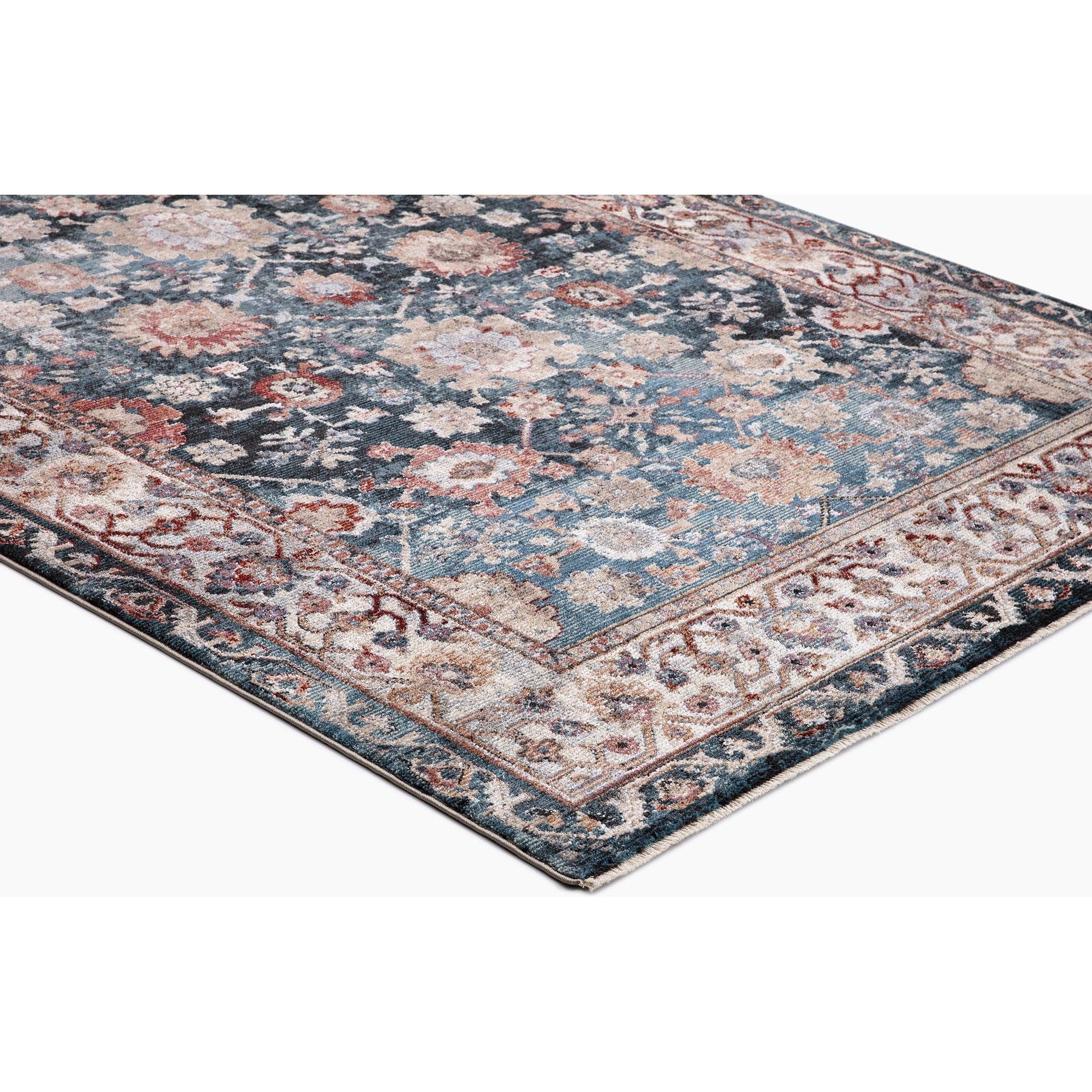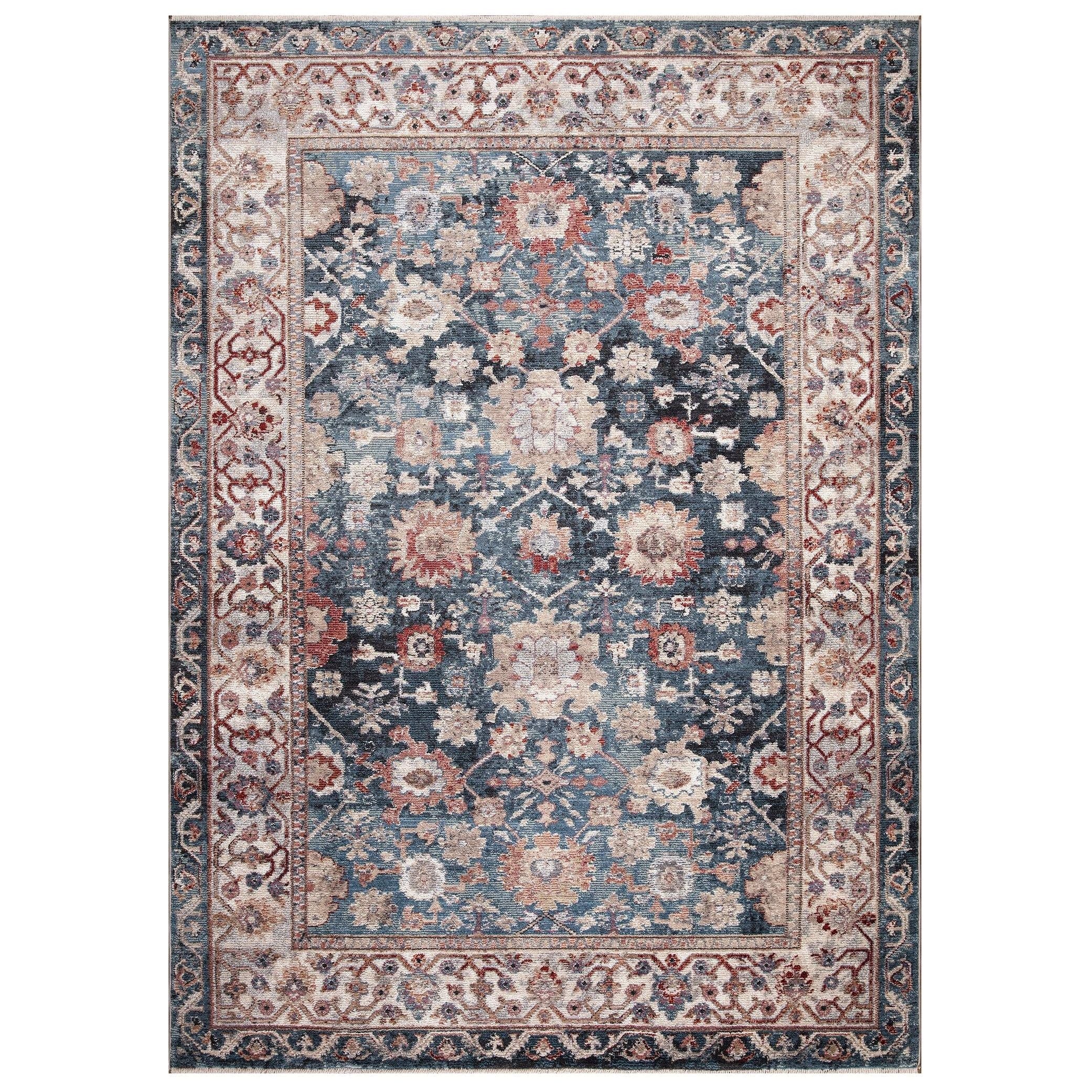 Pandora Cassandra Navy area rug, a stunning addition to elevate your home decor. Crafted with the finest wool-like material, this rug exudes elegance and charm. Its warm colors and plush texture create a cozy atmosphere that complements various styles such as vintage, shabby chic, farmhouse, and boho.