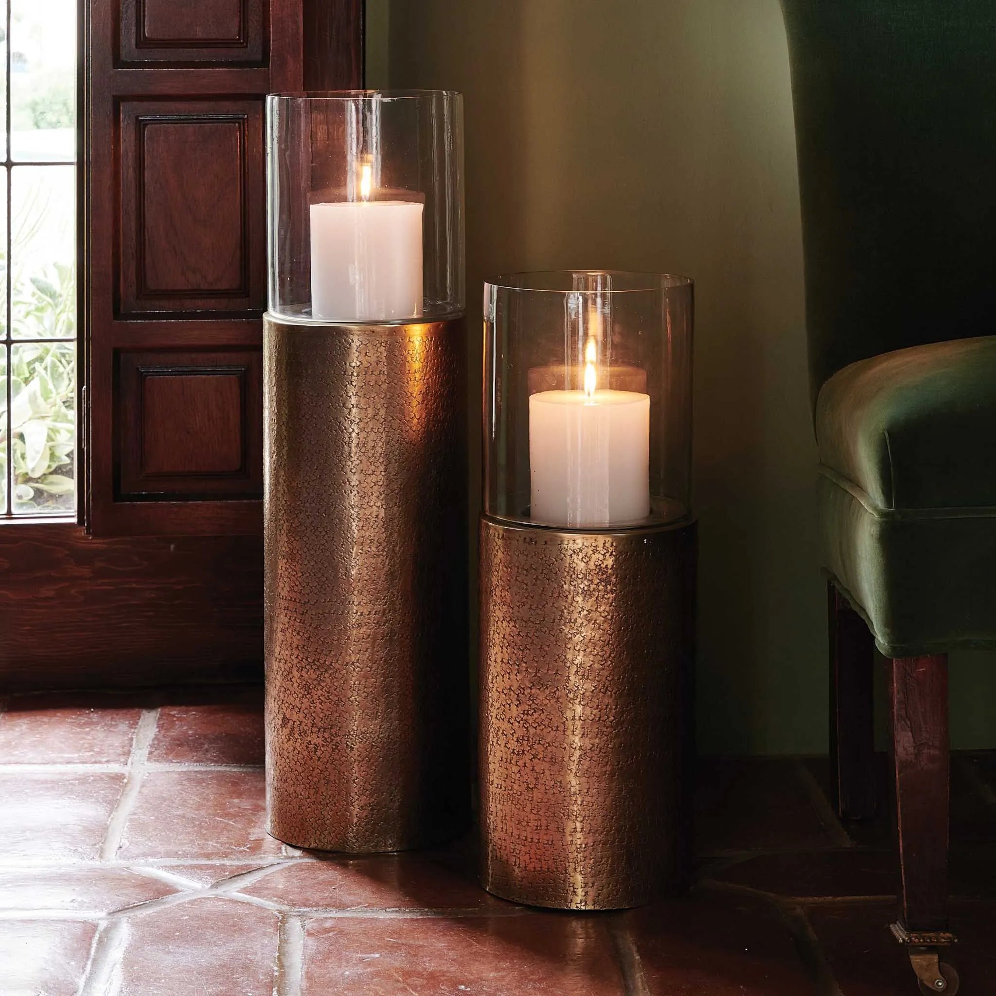 Dramatic, elongated base elevates the glamour of the antiqued Brass Ismay hurricane with hammered texture. Glass inserts included.