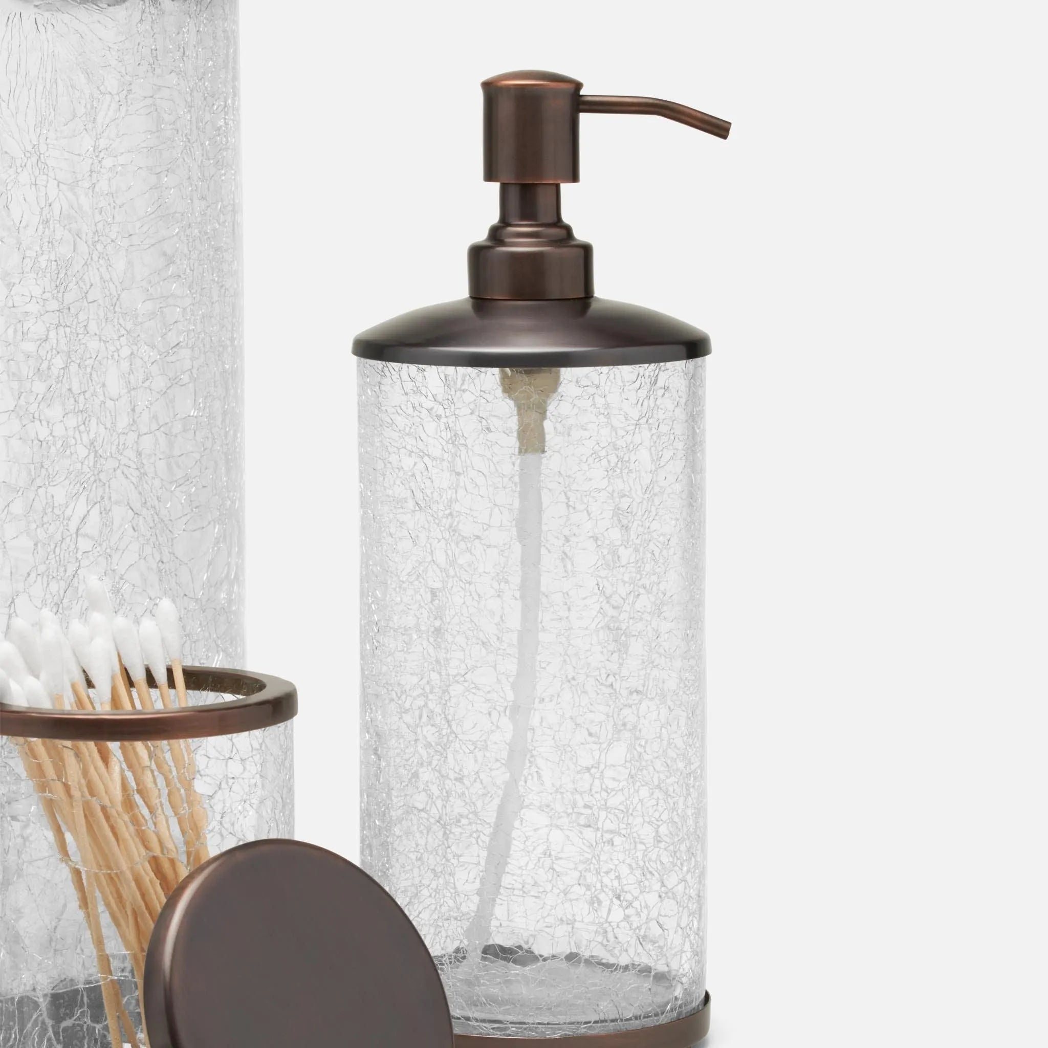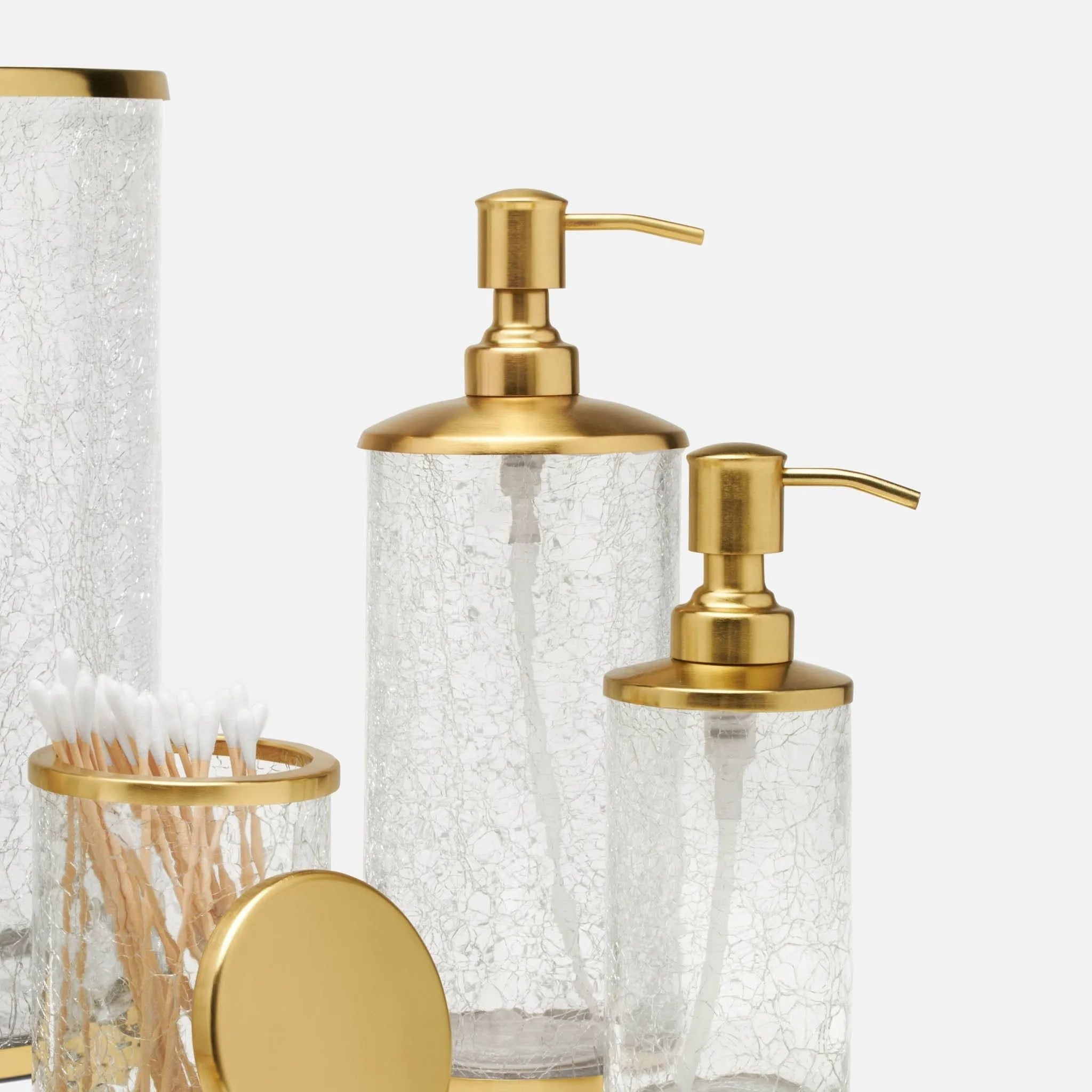 Subtly glamorous, our Pomaria bath collection brightens a bathroom with light-catching crackled glass accented in brushed Gold, brushed Silver, or dark bronze.