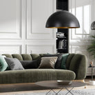 Dark and warm energies collide in a stylish fashion with this ceiling fixture. Hanging in the industrial kitchen or dining space, its aluminum matte black outer shade and matte gold inner shade complement the style of the space. The black fabric tube has a delicate appearance, and the lamp is included for ease in installation.