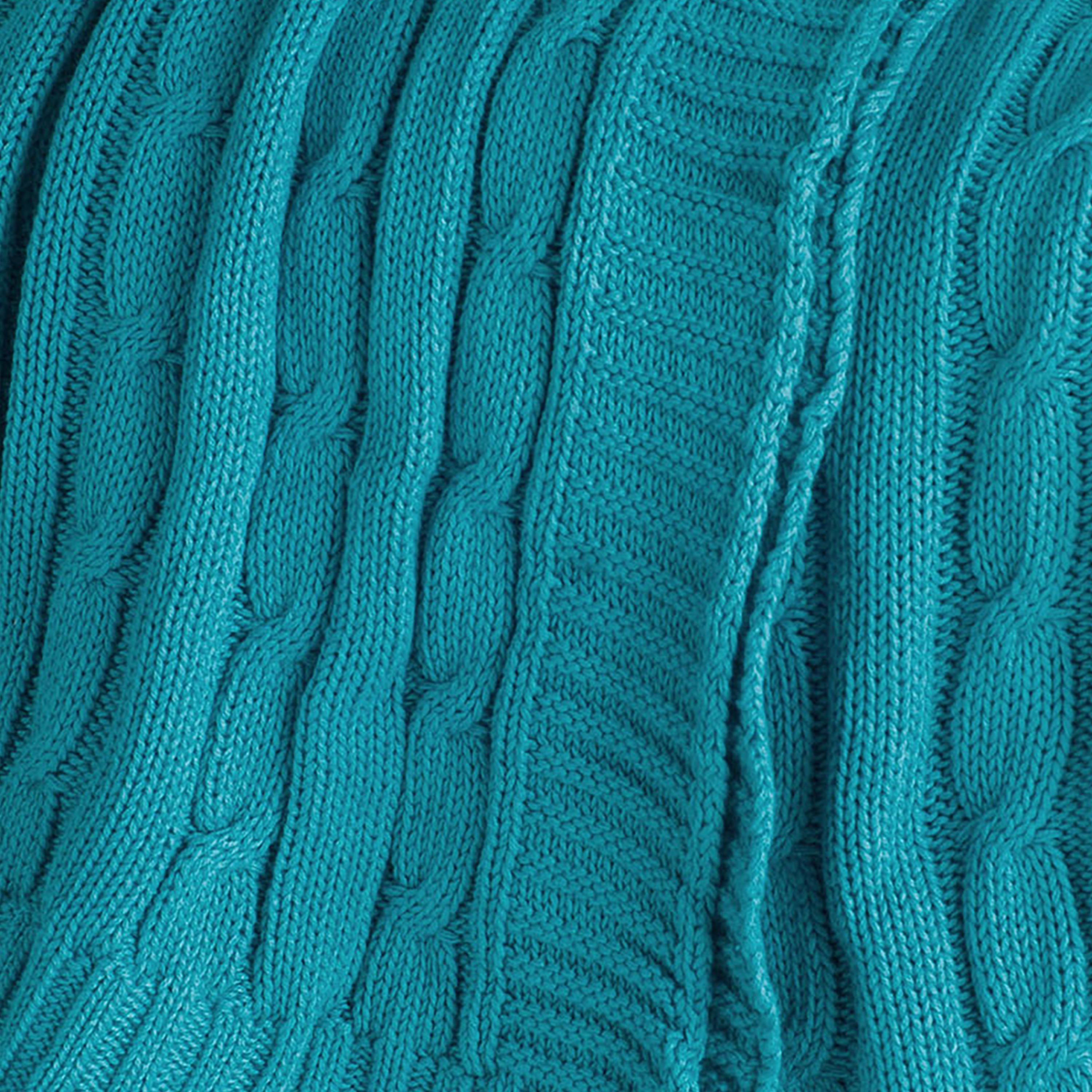 This loose weave traditional cable knit throw from Rizzy Home is the ultimate statement piece for your home décor with the perfect balance of comfort and style. Designed with a soft fabric in a knit construction, this 50" x 60" throw is perfect for snuggling on a chilly evening or adding a touch of sophistication to your favorite chaise or bedding ensemble. The bright teal hue adds energy and a pop of color to any living space. The knitted border on all four edges ensures that the throw will retain its shape even after washing, with a reverse pattern that's visible even from the back. Versatile enough to complement a variety of colors, styles and motifs, while creating a cozy escape, this throw is an ideal addition for all the comforts of home.