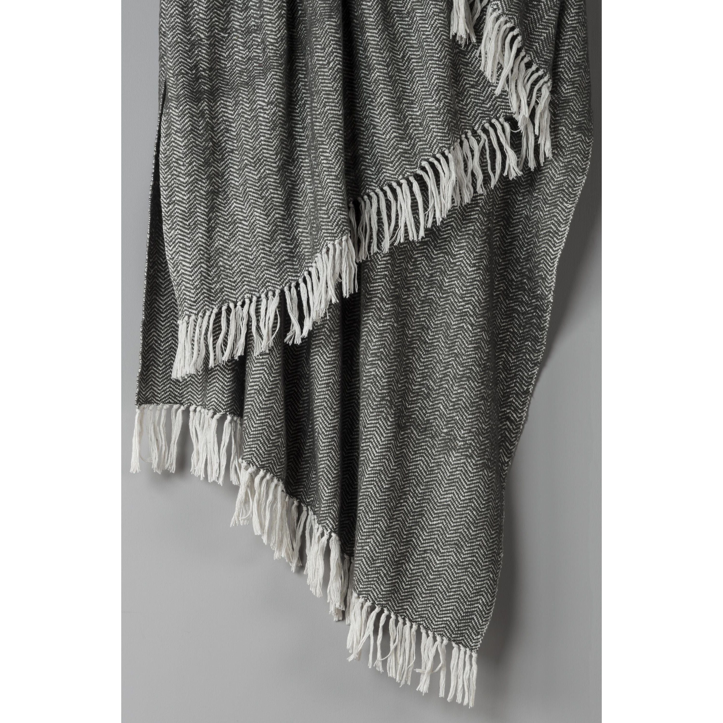 A stunning, fine, herringbone weave is created on this Rizzy Home Grey and Ivory Reversible Throw Blanket -- a perfect addition to the sofa or family room of your home. The 100-percent cotton yarn has been brushed on both sides of the throw for softness and comfort; plus it has hand-tied tassels on two ends. This throw is machine washable and dryable for worry-free care.