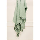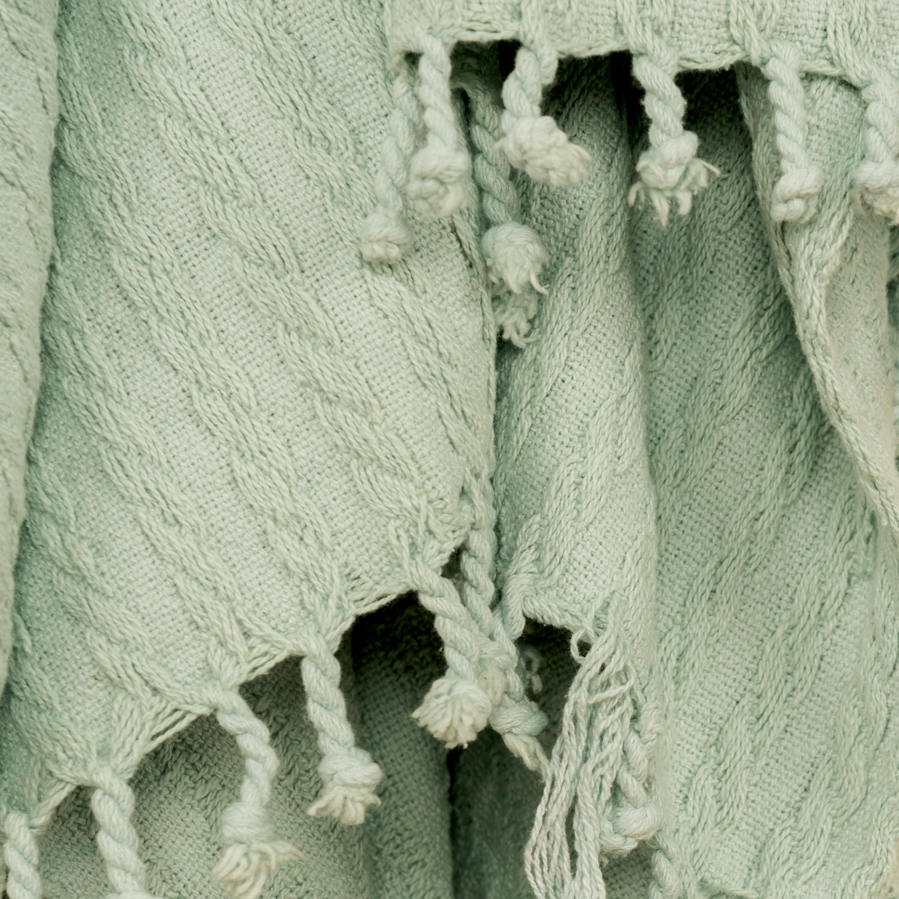This 50" x 60" cotton knitted throw from Rizzy Home makes a warm addition to any refined décor styles. This beautiful throw combines transitional and modern industrial styles with its cable knit pattern and solid design, making it an elegant and sophisticated choice for any elevated interior. Crafted with medium tightness knitted cable knit and medium texture, this throw boasts a heavy self-fringe, hand twisted and secured for durability. It is also made of medium-weight 100% cotton, providing both warmth and comfort, making it the perfect cozy accent to your favorite spot in the house. In a soft aqua color, this throw exudes subtle sophistication in a polished aesthetic. Great for snuggling up with a hot chocolate for movie night, this is sure to become your go-to snuggle blanket for chilly nights at home.