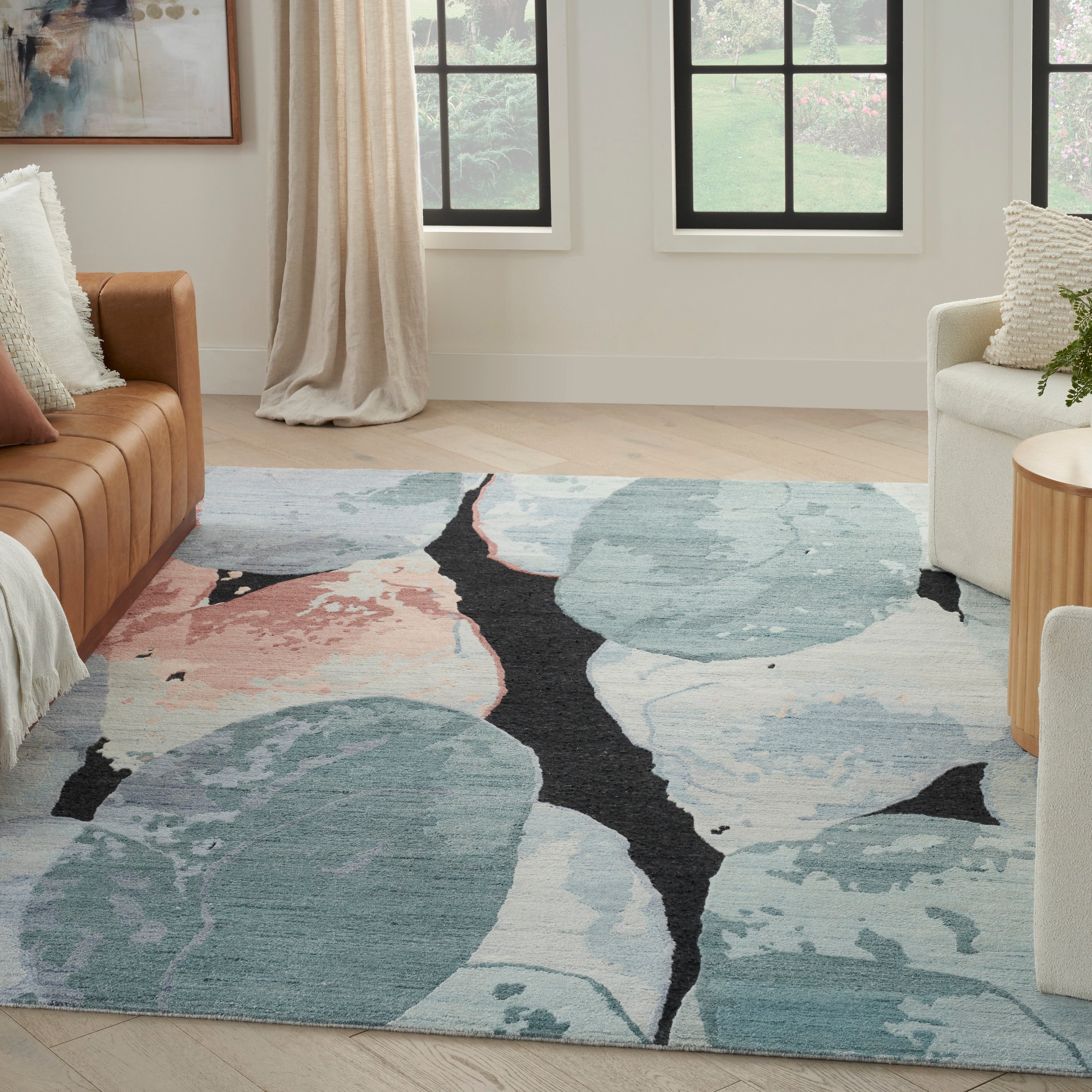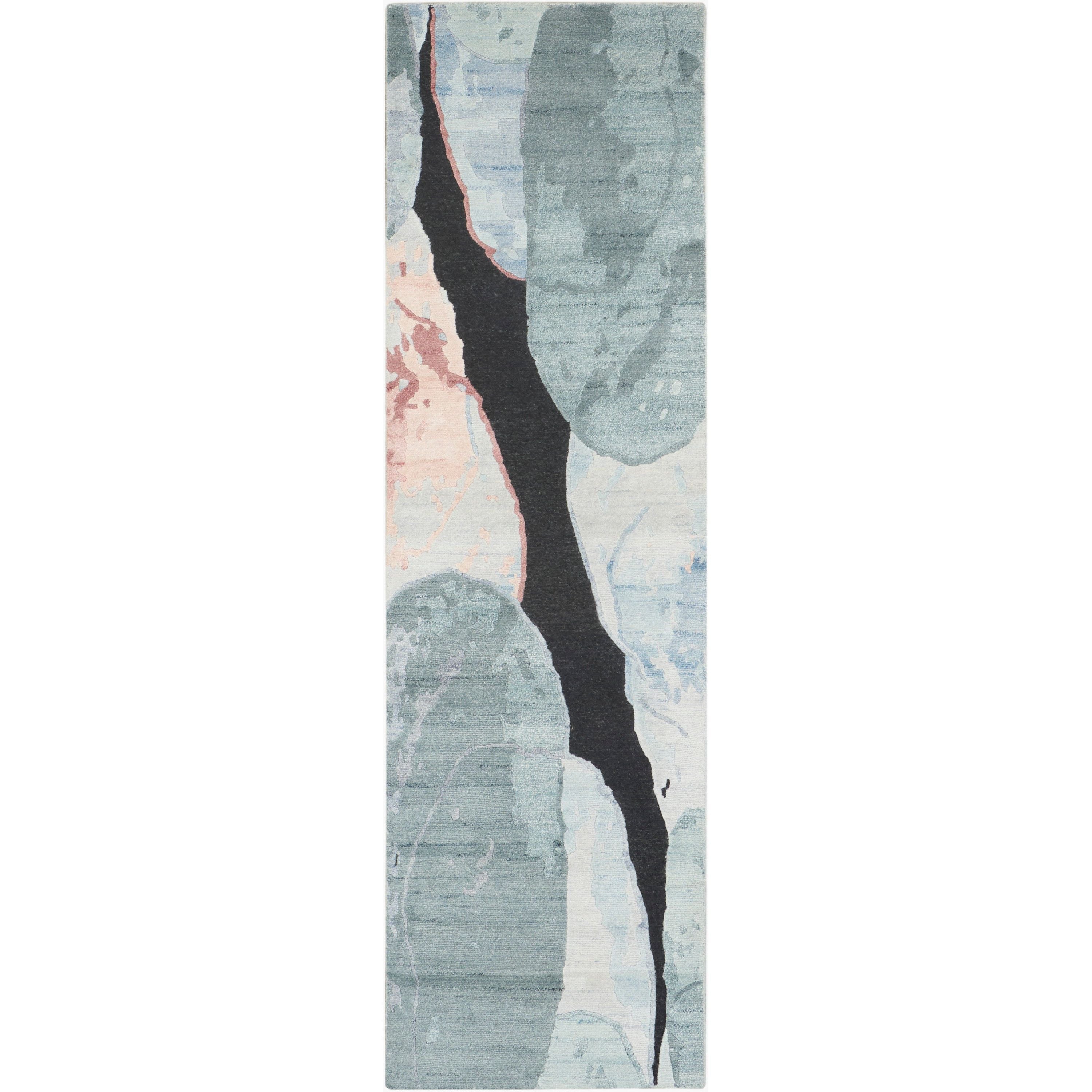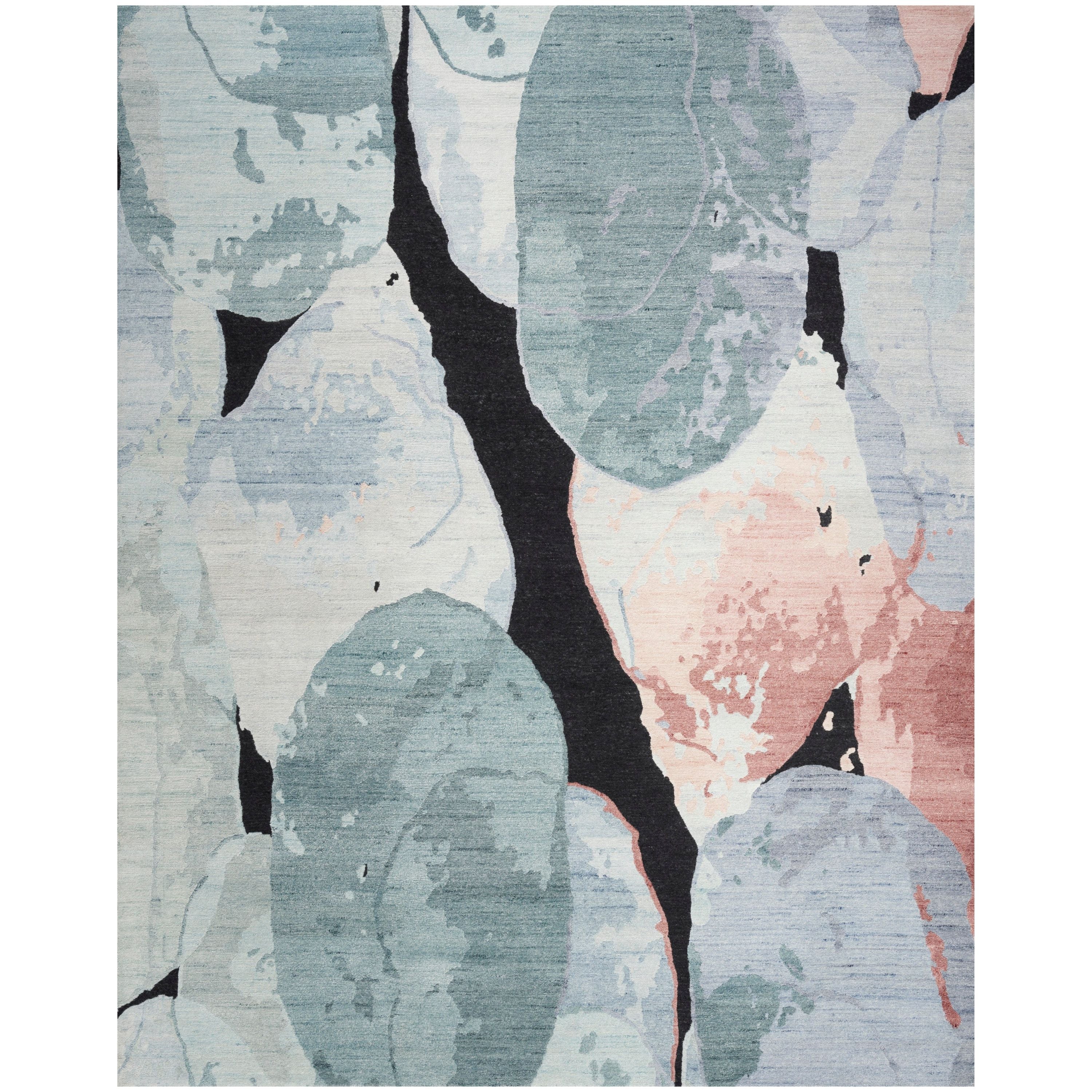 Elevate the ambiance of your living area with a touch of elegance from the Silk Shadows Collection. The abstract design of this rug features soft blue and pink tones that pop against a sleek black backdrop, adding a striking focal point to any room. Hand-knotted with precision using a blend of silk-like yarns and wool, this rug promises both durability and timeless style.