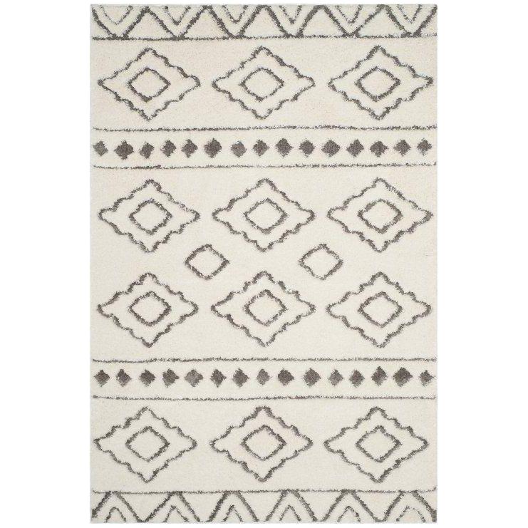 Sparta Shag SPG513C Ivory Grey rug, a luxurious addition to your home decor. Inspired by Moroccan design, this rug features intricate geometric patterns expertly woven into its plush shag texture. The 1-inch pile height adds depth and dimension to any room, while also offering a cozy feel underfoot. Made with high-quality polyester fibers, this rug boasts a silky sheen that enhances its elegant appeal.
