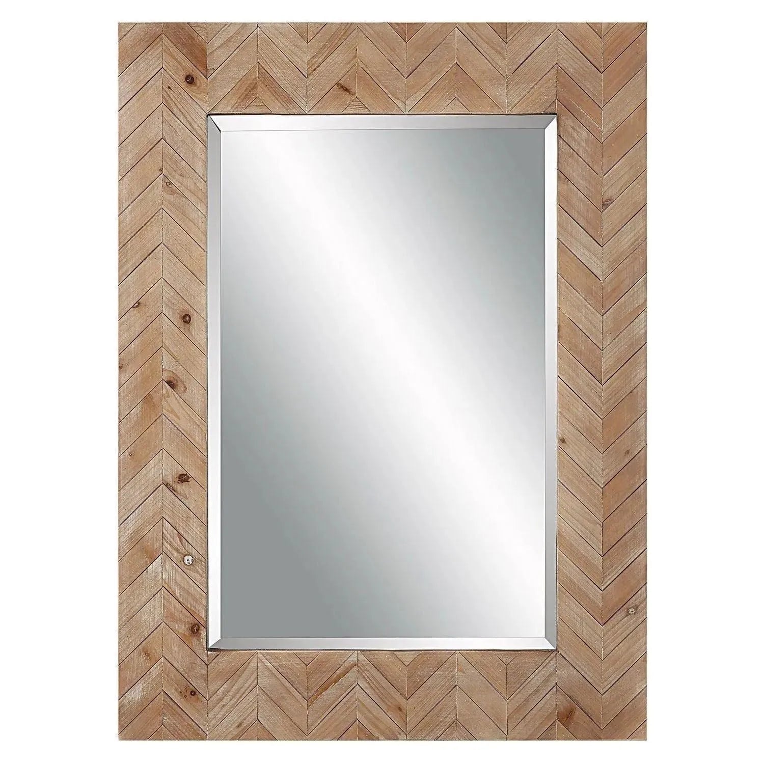 This Stately Mirror Features a Chevron-Patterned, Solid Wood Frame Finished with a Light Gray Glaze. The Mirror Includes a Generous 1 1/4" Bevel and May Be Hung Horizontal or Vertical.