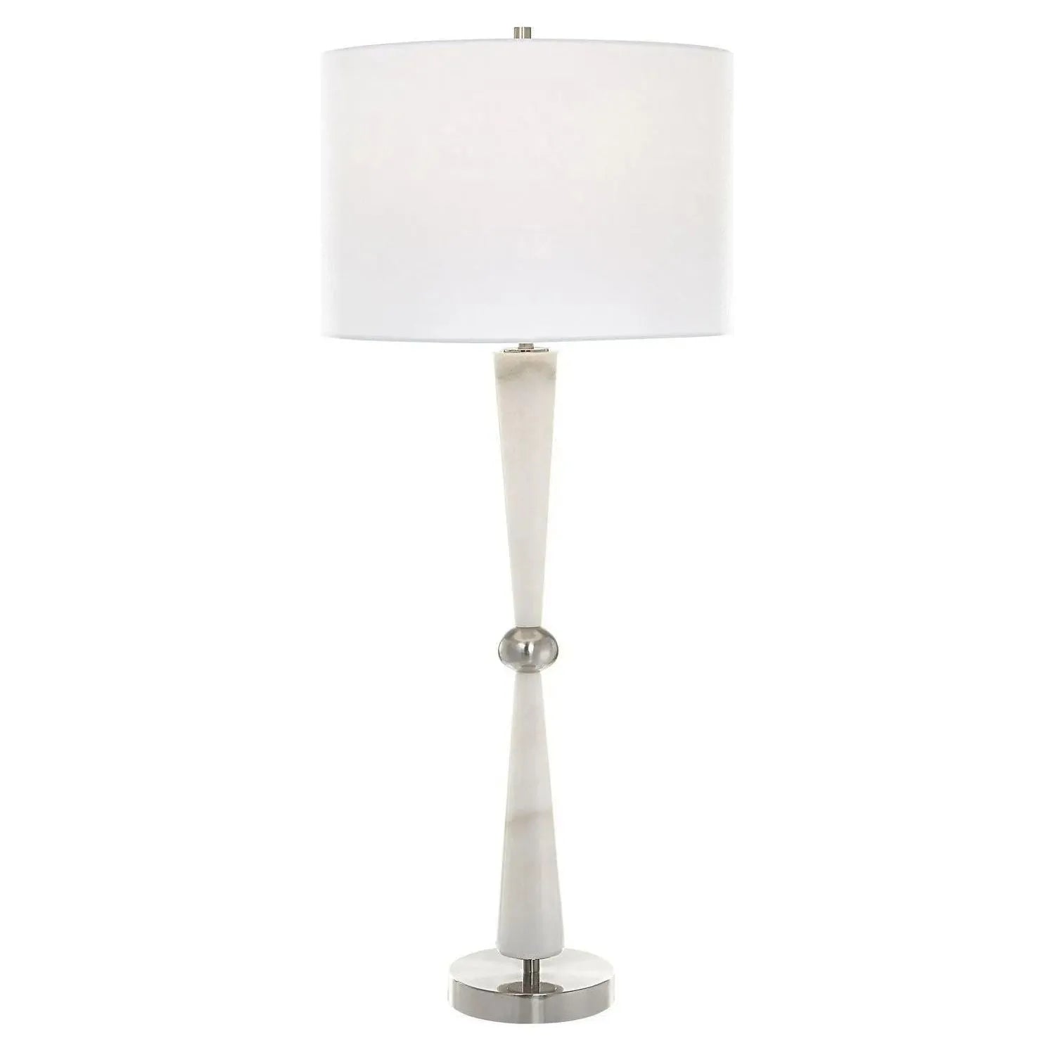 Timeless And Sophisticated, This Table Lamp Boasts Tapered White Marble With Subtle Gray Veining, Accented By Iron Details Finished In Brushed Nickel. A White Hardback Drum Shade Completes This Piece.