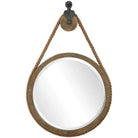 This Rustic Mirror Design Features An Aged Natural Wood Finish With Exposed Nail Head Accents And Thick Rope Detailing That Surrounds The Mirror's Frame. The Mirror Is Hung Using An Antique-inspired Pulley With Aged Black Detailing And A Matching Aged Black Decorative Hanging Hook. This Round Mirror Incorporates A Generous 1" Bevel.