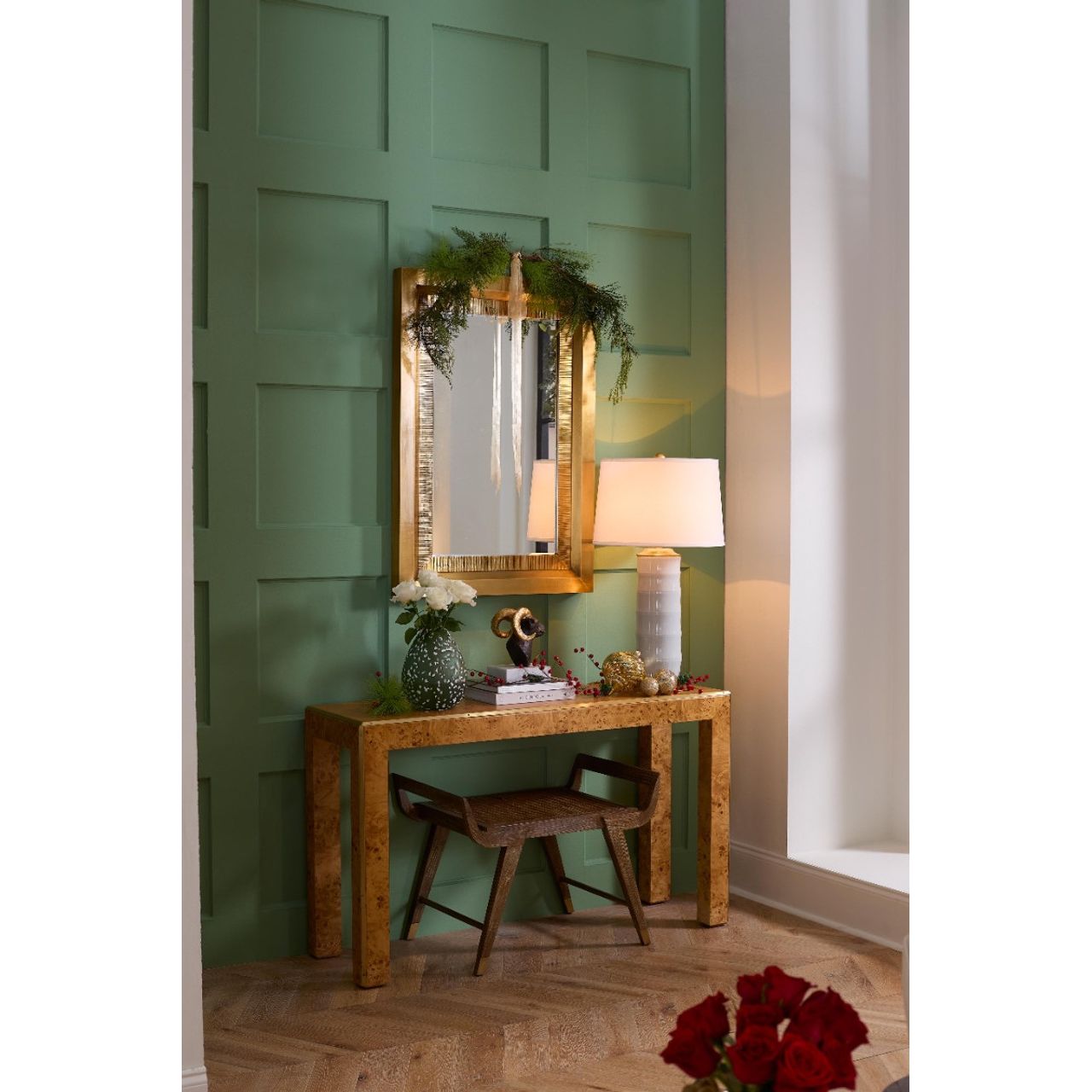 The traditional-looking Princeton Mirror is rendered modern by being completely clad in brass. Its dual-frame design consists of a brass repoussé inner frame surrounded by a larger, contrasting smooth-brass outer frame. Ideal for traditional or transitional decor, this mirror adds a touch of elegance to hallways, living rooms, or bedrooms. With its timeless craftsmanship and understated sophistication, the Princeton Mirror is an essential addition to your home decor.