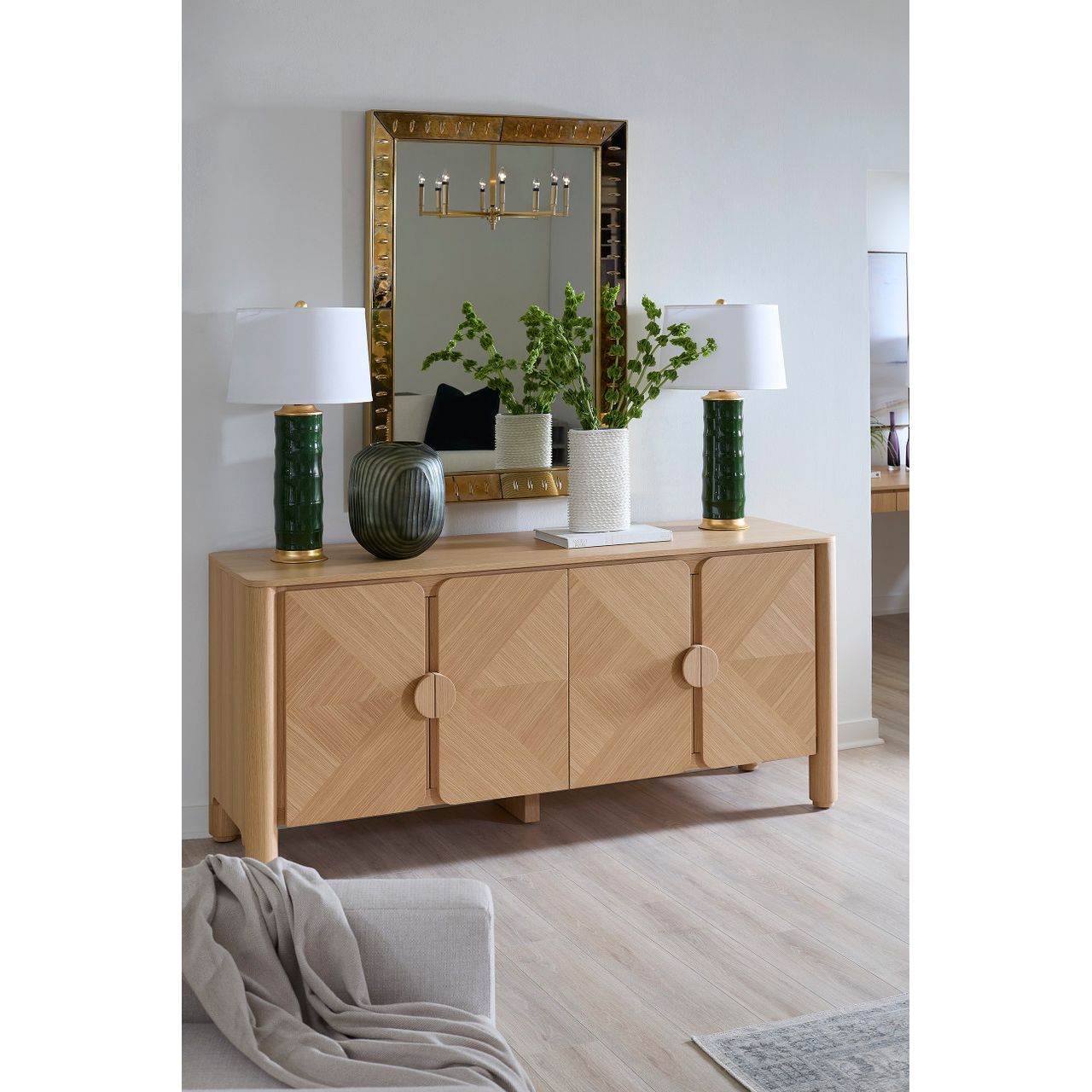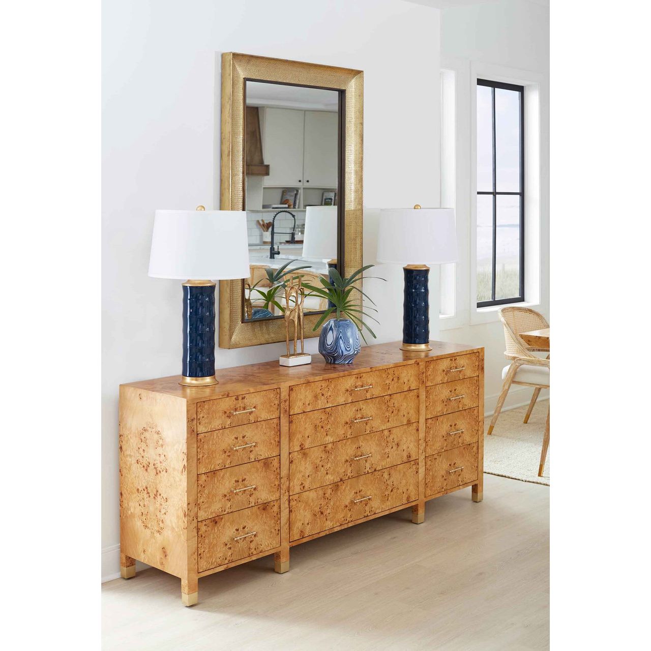 Our Saigon Collection combines contrasting elements. The traditional bamboo motif is rendered in a modern minimalist way, making it versatile and suited to both traditional and modern settings. The hand-glazed rich pallette of colors and the gold-leaf details give it an air of sophistication and elegance. The Saigon is sure to be the talking point of your living room. Our Saigon Collection combines contrasting elements. The traditional bamboo motif is rendered in a modern minimalist way, making it versatile and suited to both traditional and modern settings. The hand-glazed rich pallette of colors and the gold-leaf details give it an air of sophistication and elegance. The Saigon is sure to be the talking point of your living room. This lamp is topped with a crisp white laminated linen shade, accented with brass hardware.